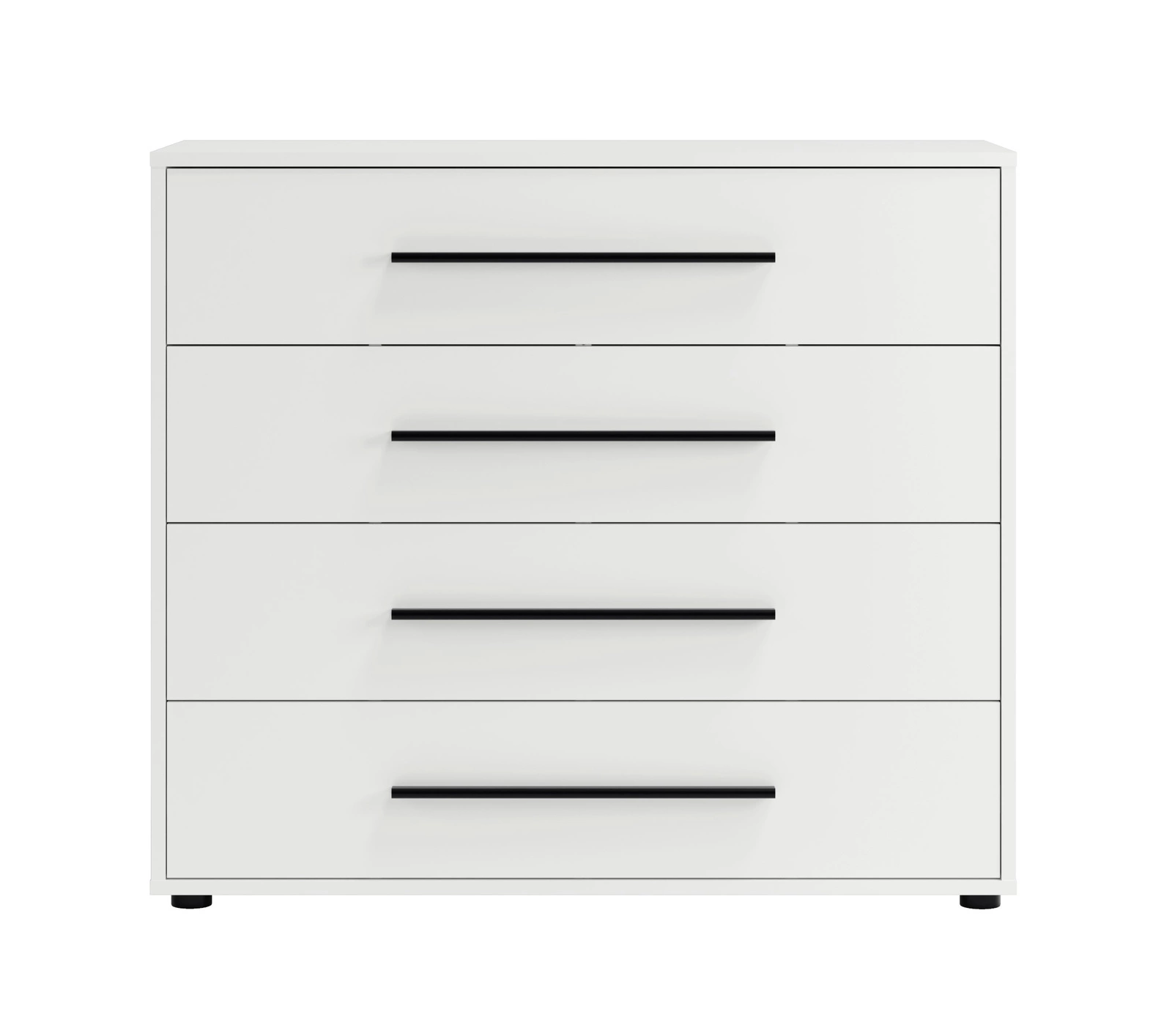 • Komoda Modena biała z 4 pojemnymi szufladami. Funkcjonalna i nowoczesna – idealna do sypialni, salonu czy pokoju młodzieżowego.