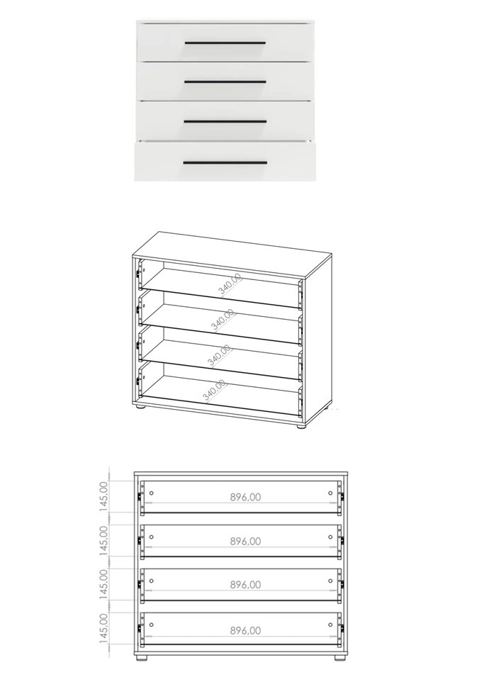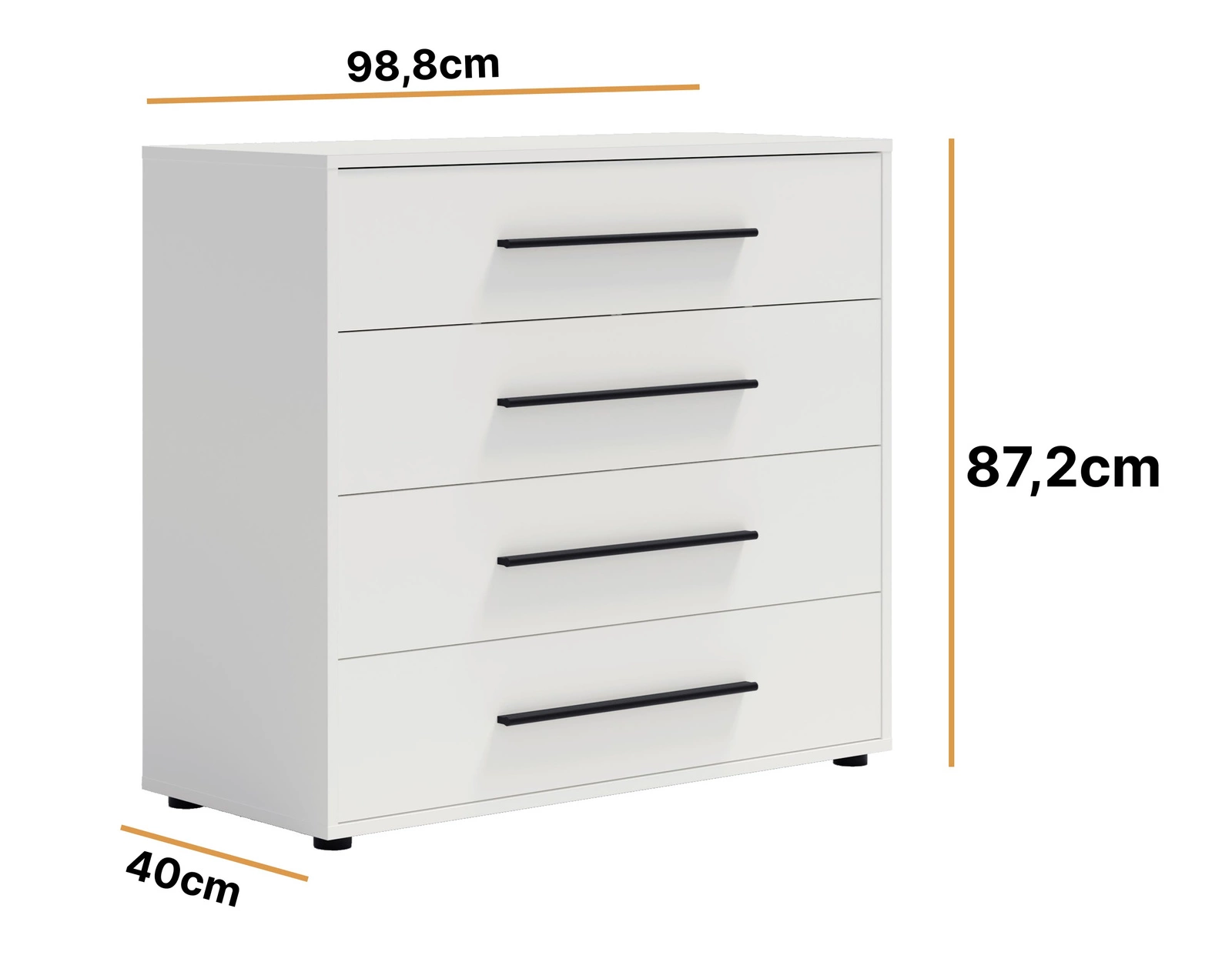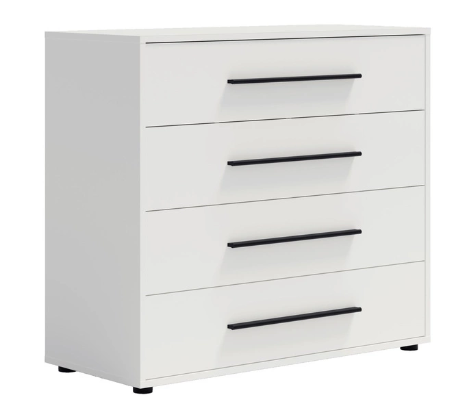 Wyposażona w cztery szerokie i pojemne szuflady, komoda świetnie sprawdzi się w sypialni, salonie czy pokoju młodzieżowym. Bez problemu zmieścisz w niej odzież, bieliznę, dokumenty lub akcesoria, zachowując porządek i mając wszystko pod ręką. Stabilna konstrukcja i solidne prowadnice szuflad zapewniają komfort użytkowania na co dzień, a gładki blat komody to idealne miejsce na dekoracje, ramki ze zdjęciami czy ulubione rośliny.
