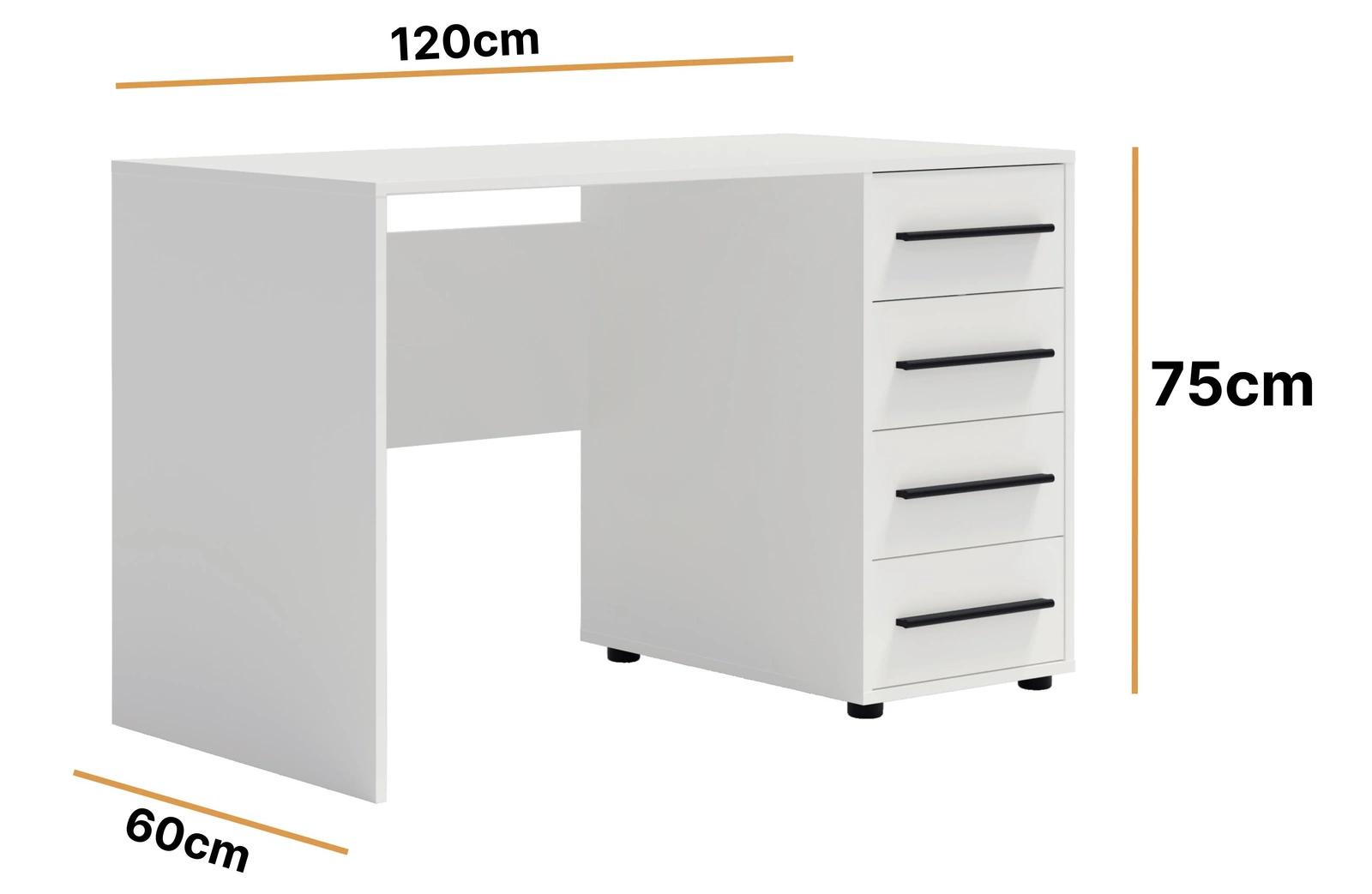 Dzięki czterem praktycznym szufladom umieszczonym po prawej stronie, biurko zapewnia wygodne przechowywanie wszystkich niezbędnych akcesoriów biurowych, dokumentów, zeszytów czy drobiazgów, które chcesz mieć zawsze pod ręką. Gładki blat o optymalnej szerokości umożliwia komfortową pracę przy komputerze, a także swobodne wykonywanie codziennych obowiązków i nauki. Stabilna konstrukcja gwarantuje trwałość i pewność użytkowania na lata.