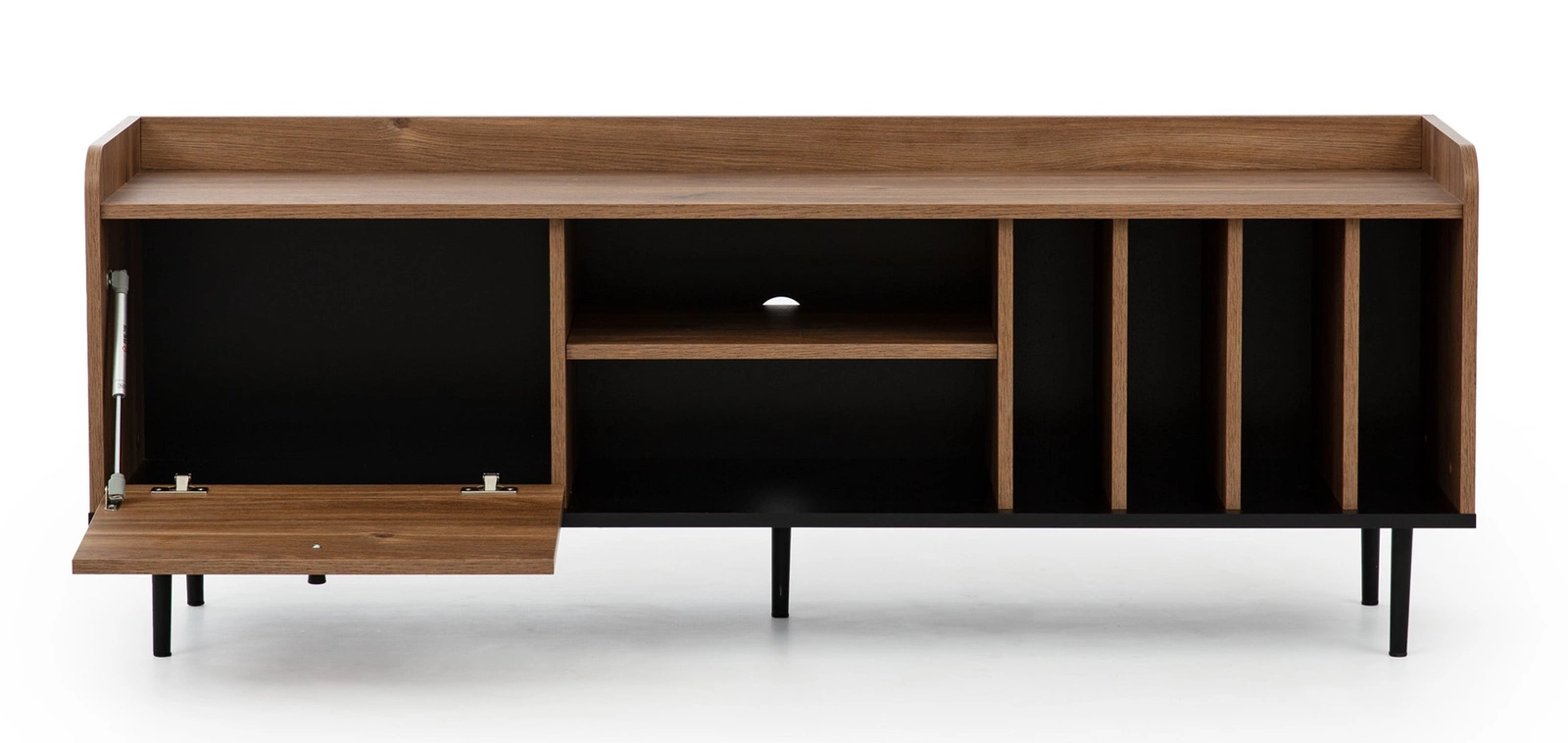 Stolik RTV o wyjątkowym designie, posiadający wnęki, w których można umieścić np. płyty winylowe lub albumy ze zdjęciami. Otwierany do dołu schowek pozwoli pomieścić wszystkie potrzebne drobiazgi. Metalowy stelaż i wykorzystane materiały zapewniają stabilność i sprawią, że mebel posłuży długimi latami.