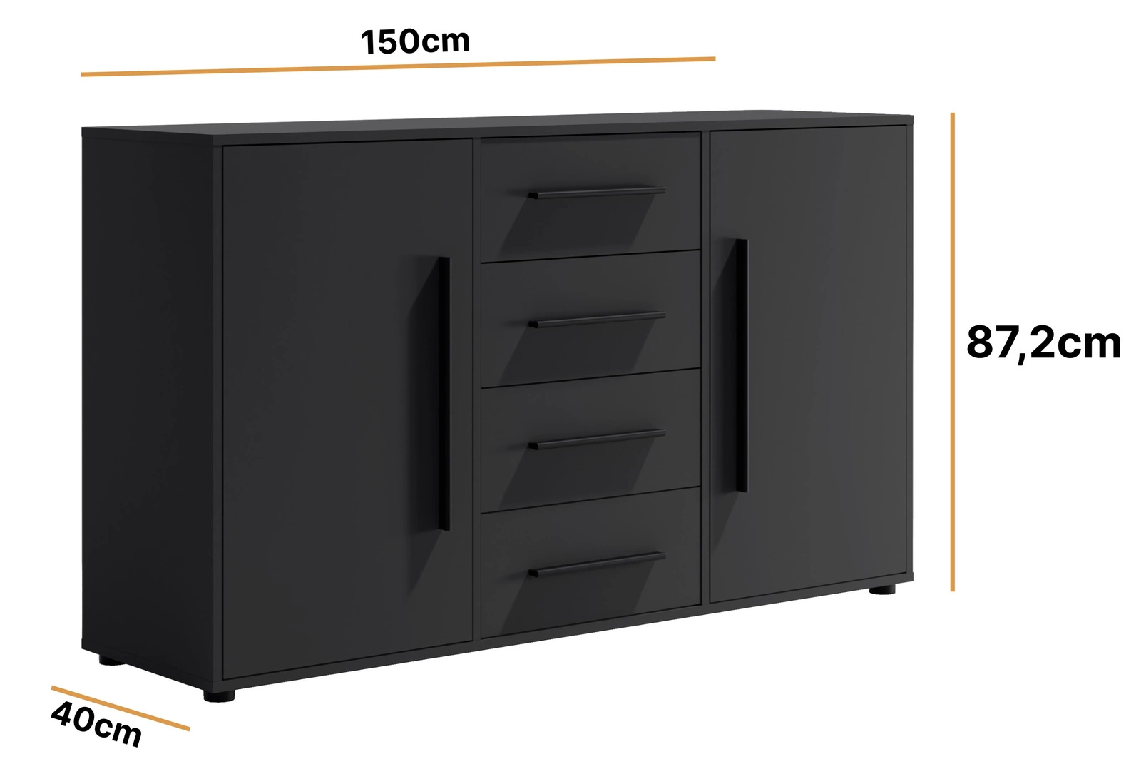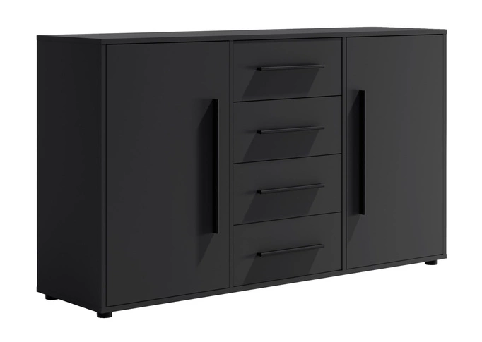 • Czarna komoda Modena z 4 szufladami i 2 szafkami. Nowoczesna, pojemna i uniwersalna – idealna do salonu, sypialni i przedpokoju.
