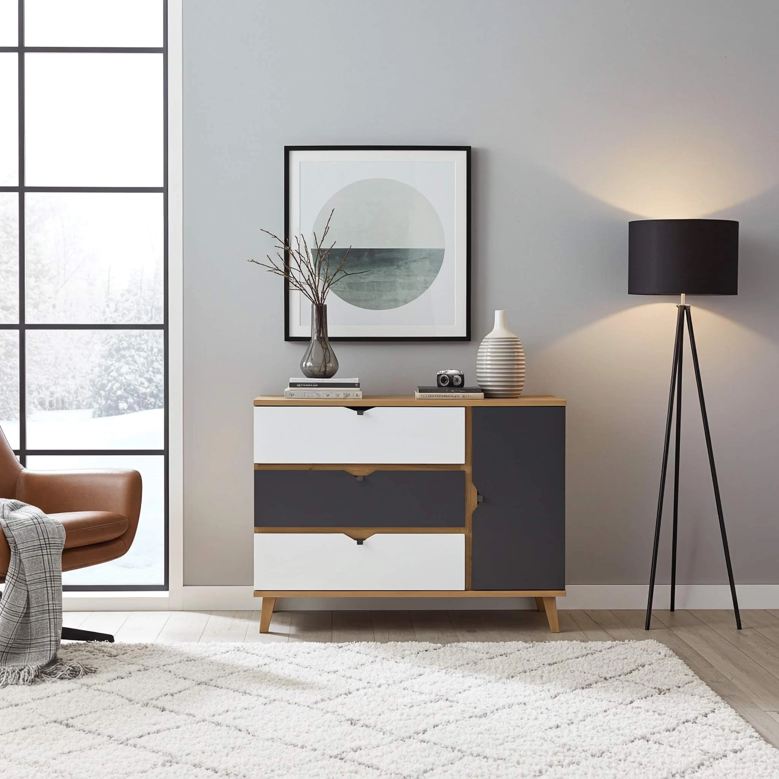 - Pojemna komoda na ubrania w kolorze Dąb Złoty / Grafit + Biały szerokość 120 cm – idealna do salonu lub sypialni, doda stylu i funkcjonalności Twojemu wnętrzu.