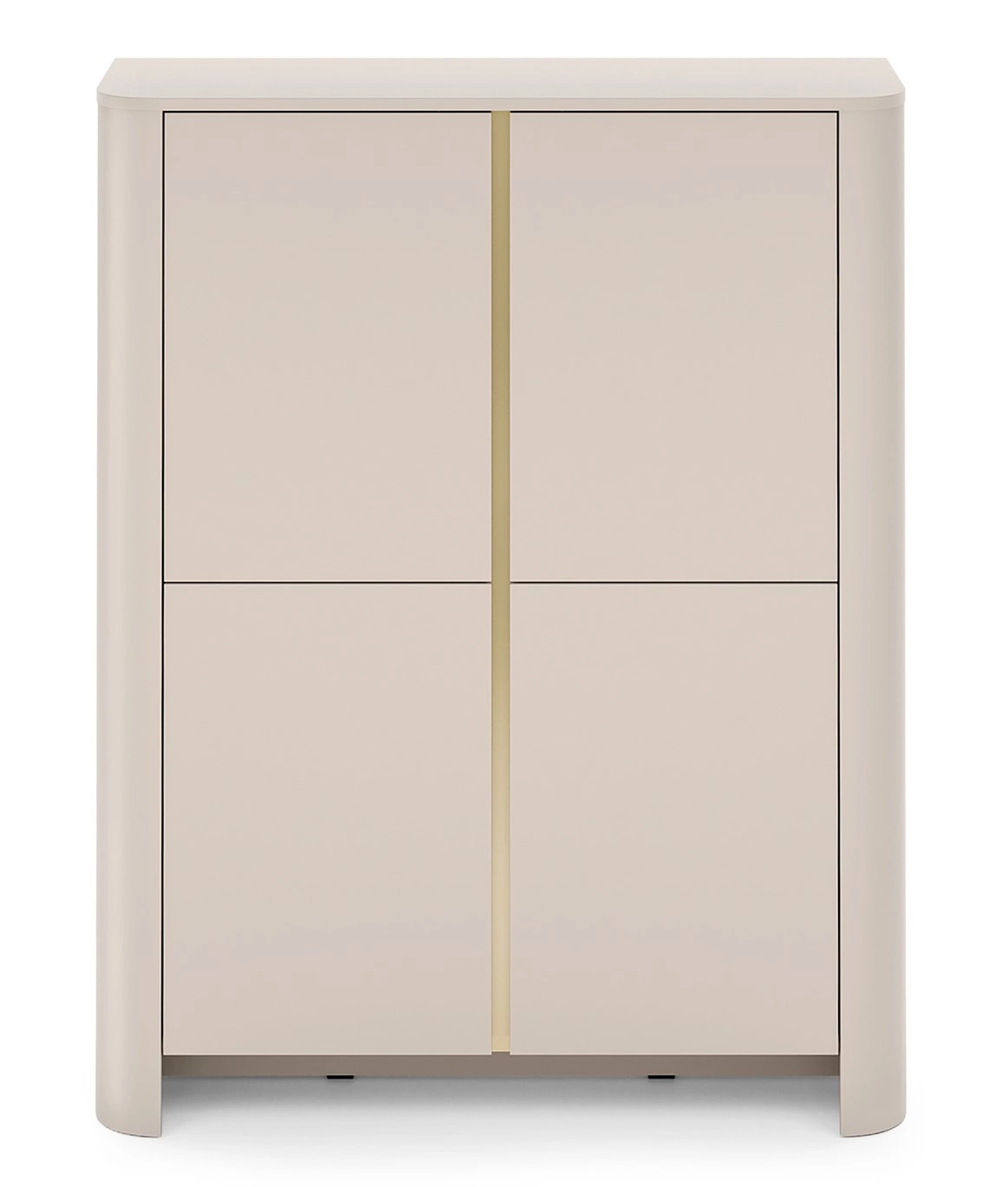 - Elegancka i nowoczesna komoda Aura w wybarwieniu kaszmir ze złotym akcentem to idealne połączenie minimalistycznej formy z subtelną nutą luksusu. Pojemne półki ukryte za czterema frontami pomogą Ci zachować porządek w salonie, sypialni lub przedpokoju.