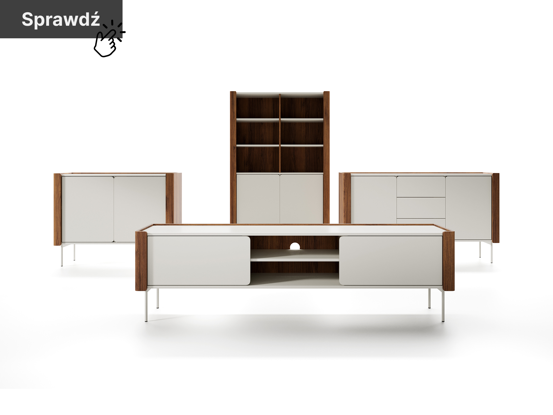 Mebel opiera się na smukłych metalowych nóżkach, co nadaje mu wizualnej lekkości i ułatwia utrzymanie porządku. Wewnątrz znajdziesz trzy pojemne szuflady oraz dwie szafki z półkami – idealne do przechowywania tekstyliów, dokumentów czy naczyń. Komoda wyposażona została w system Push-To-Open i zawiasy z cichym domykiem Häfele, co zapewnia nie tylko wygodę, ale i estetyczną spójność z nowoczesnymi wnętrzami.