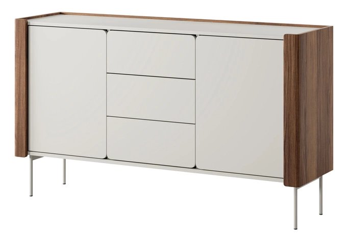 • Komoda Kalon o zaokrąglonych bokach i nowoczesnej formie. Fronty w odcieniu kaszmiru, boki w dekorze orzecha warmia. Trzy szuflady i dwie szafki z półkami. Lekka forma na smukłych nóżkach – funkcjonalność i styl w jednym.