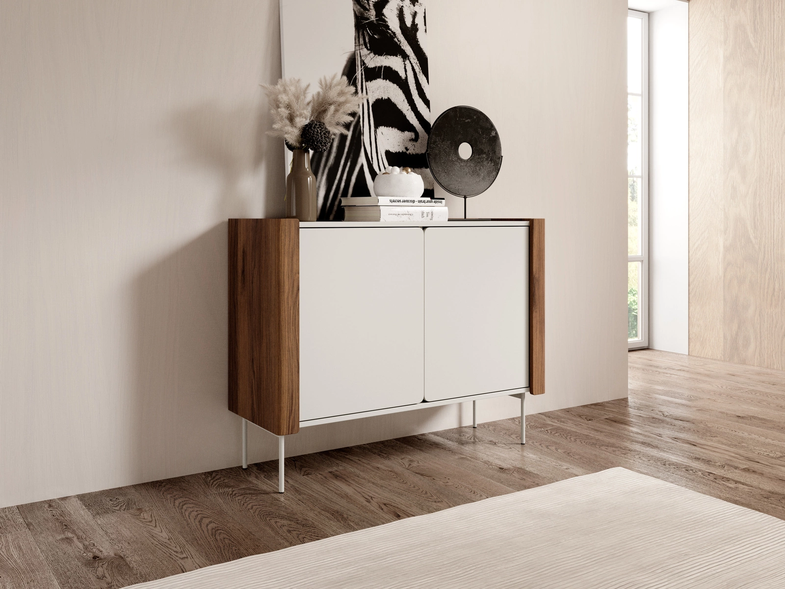 Mebel wyposażony jest w dwoje drzwi, za którymi znajdują się cztery praktyczne wnęki – idealne na dokumenty, porcelanę lub domowe drobiazgi. System otwierania Push to Open oraz wysokie metalowe nóżki nie tylko podkreślają nowoczesny design, ale również ułatwiają codzienne użytkowanie i sprzątanie. Komoda doskonale sprawdzi się w salonie, holu, a także domowym biurze.