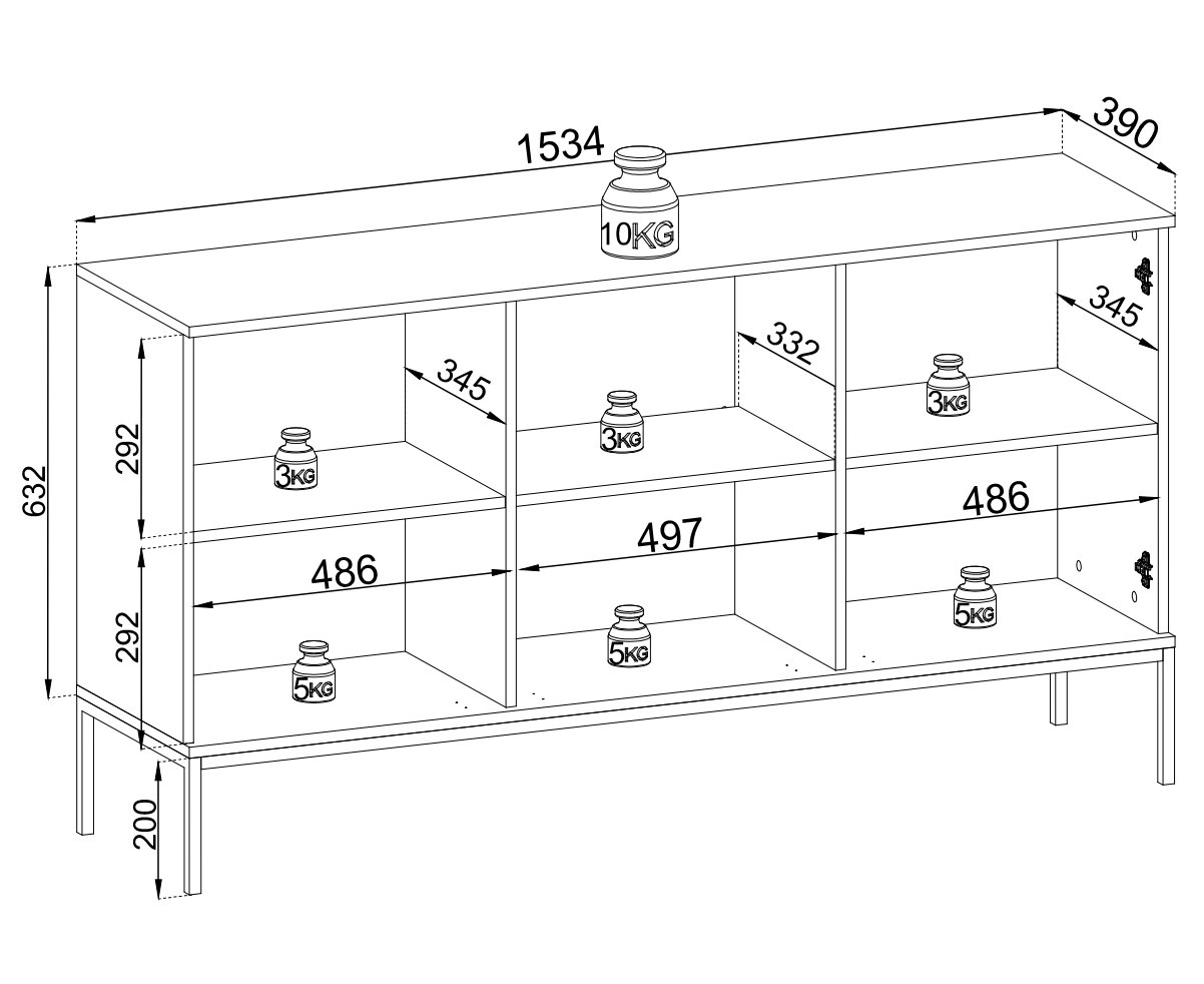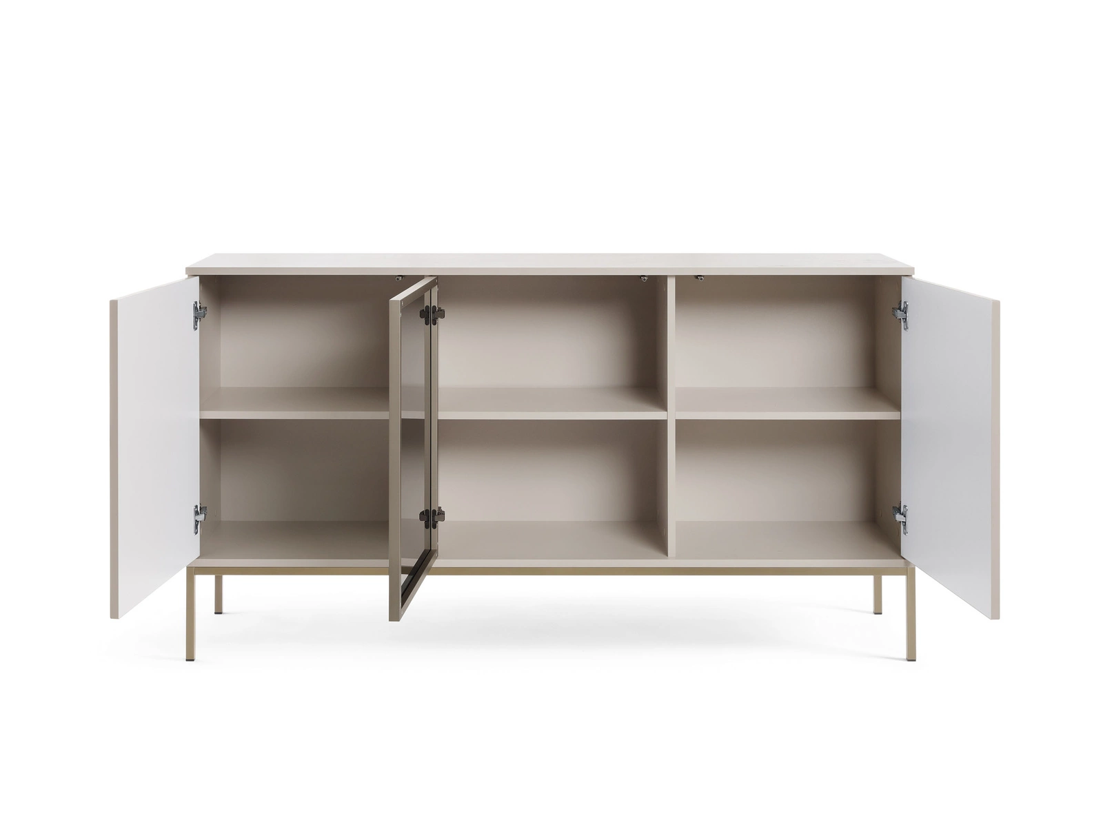 - Komoda 154 cm, kaszmir, trzydrzwiowa: dwa matowe fronty skrywają obszerne półki, trzecie drzwi ze szkła eksponują dekoracje. Całość na smukłych, metalowych nogach – lekka elegancja w nowoczesnym wnętrzu.
