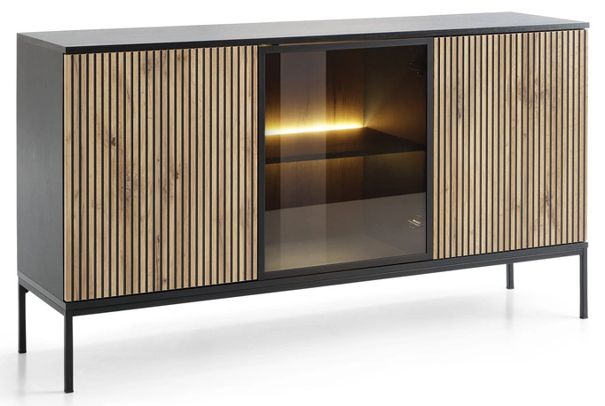 Komoda o szerokości 154 cm w odcieniu Dąb Wotan–Czarny łączy funkcjonalność z nastrojowym designem. Trzy fronty – dwa pełne, matowe i jedno przeszklone – ukrywają pojemne półki na porcelanę, tekstylia czy dokumenty, a zarazem pozwalają wyeksponować ulubione dekoracje. Wnętrze za szybą rozświetla dyskretna listwa LED, budując przytulny klimat wieczorami i podkreślając detale kolekcji. Komodę osadzono na smukłych, nogach z metalu, które dodają lekkości oraz industrialnego sznytu i ułatwiają sprzątanie pod meblem. Solidna płyta meblowa gwarantuje stabilność i komfort codziennego użytkowania. To stylowy akcent, który wprowadzi elegancję i funkcjonalne światło do nowoczesnego salonu, sypialni czy jadalni.
