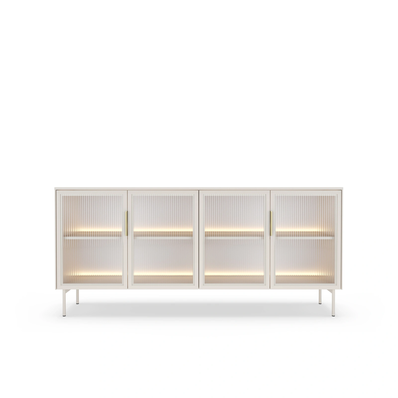 Komoda LUMI 181 cm Kaszmir – 4 Drzwi, Ryflowane Szkło, Złote Uchwyty, LED