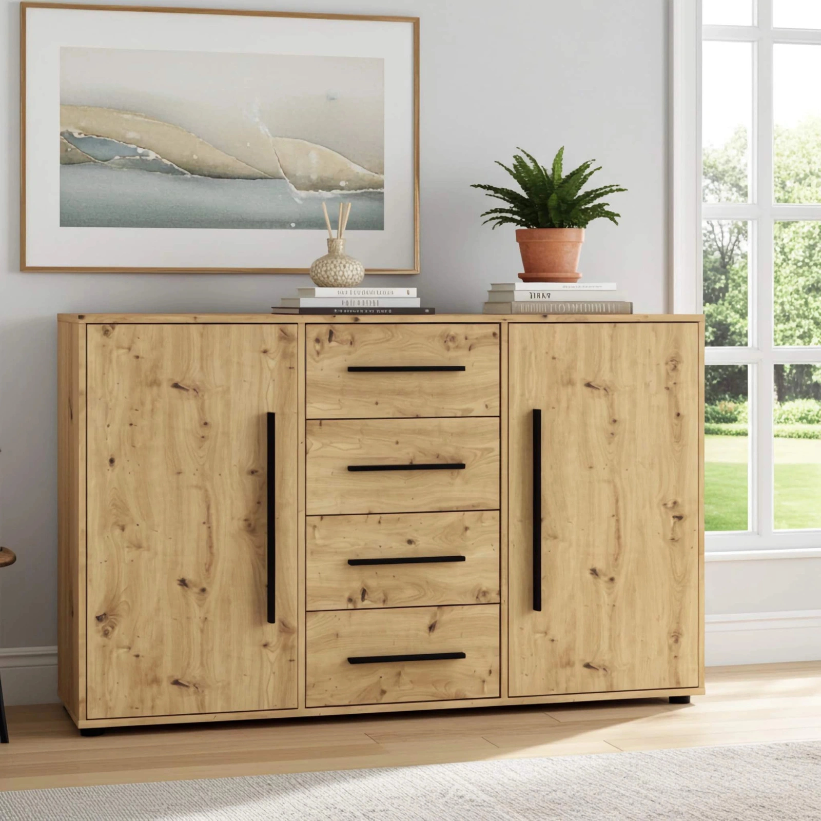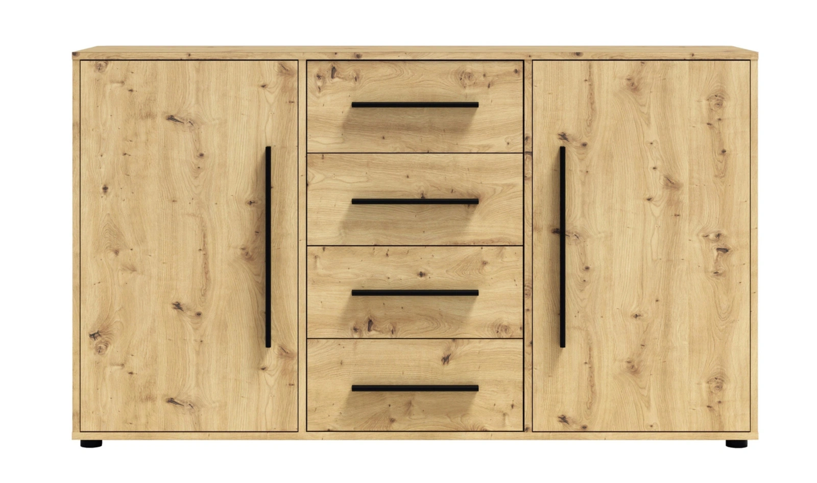 - Komoda w kolorze dąb artisan Modena z 4 szufladami i 2 szafkami. Nowoczesna, pojemna i uniwersalna – idealna do salonu, sypialni i przedpokoju.