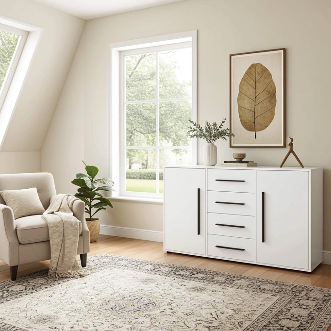 Wyposażona w cztery pojemne szuflady umieszczone centralnie oraz dwie boczne szafki z półkami, komoda zapewnia maksymalną funkcjonalność i komfort przechowywania. Dzięki niej z łatwością zorganizujesz przestrzeń w salonie, sypialni czy przedpokoju, znajdując miejsce na ubrania, bieliznę, dokumenty lub inne domowe akcesoria. Szeroki blat komody to idealna przestrzeń na dekoracje, rośliny, lampki czy ulubione ramki ze zdjęciami, które nadadzą wnętrzu indywidualnego charakteru.