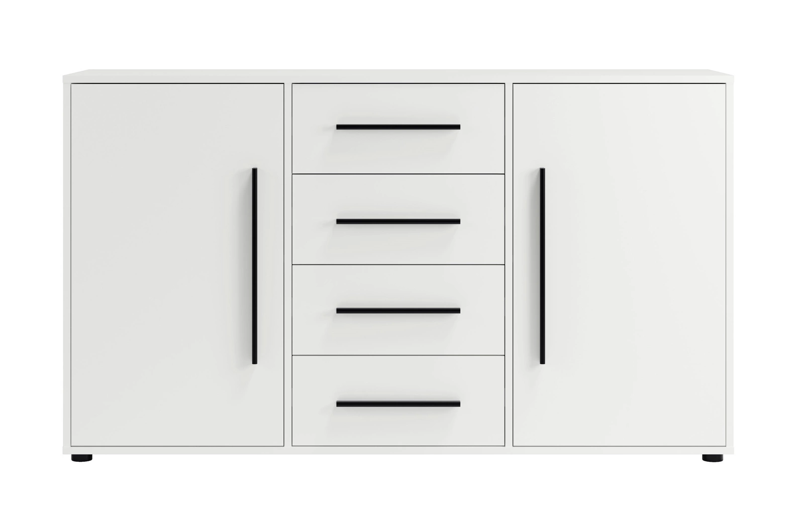 • Biała komoda Modena z 4 szufladami i 2 szafkami. Nowoczesna, pojemna i uniwersalna – idealna do salonu, sypialni i przedpokoju.