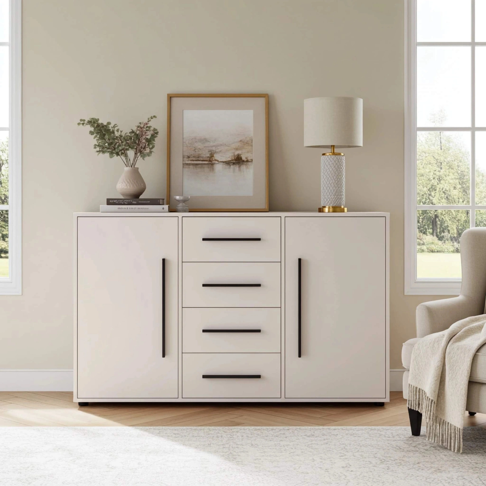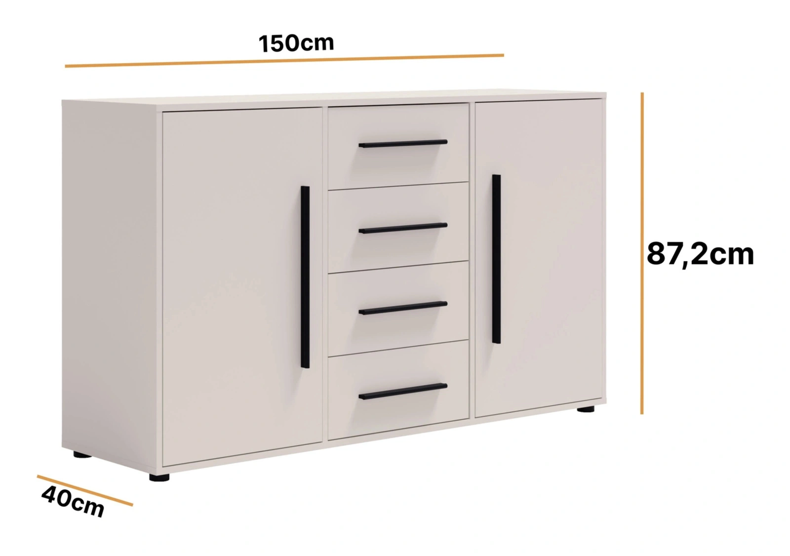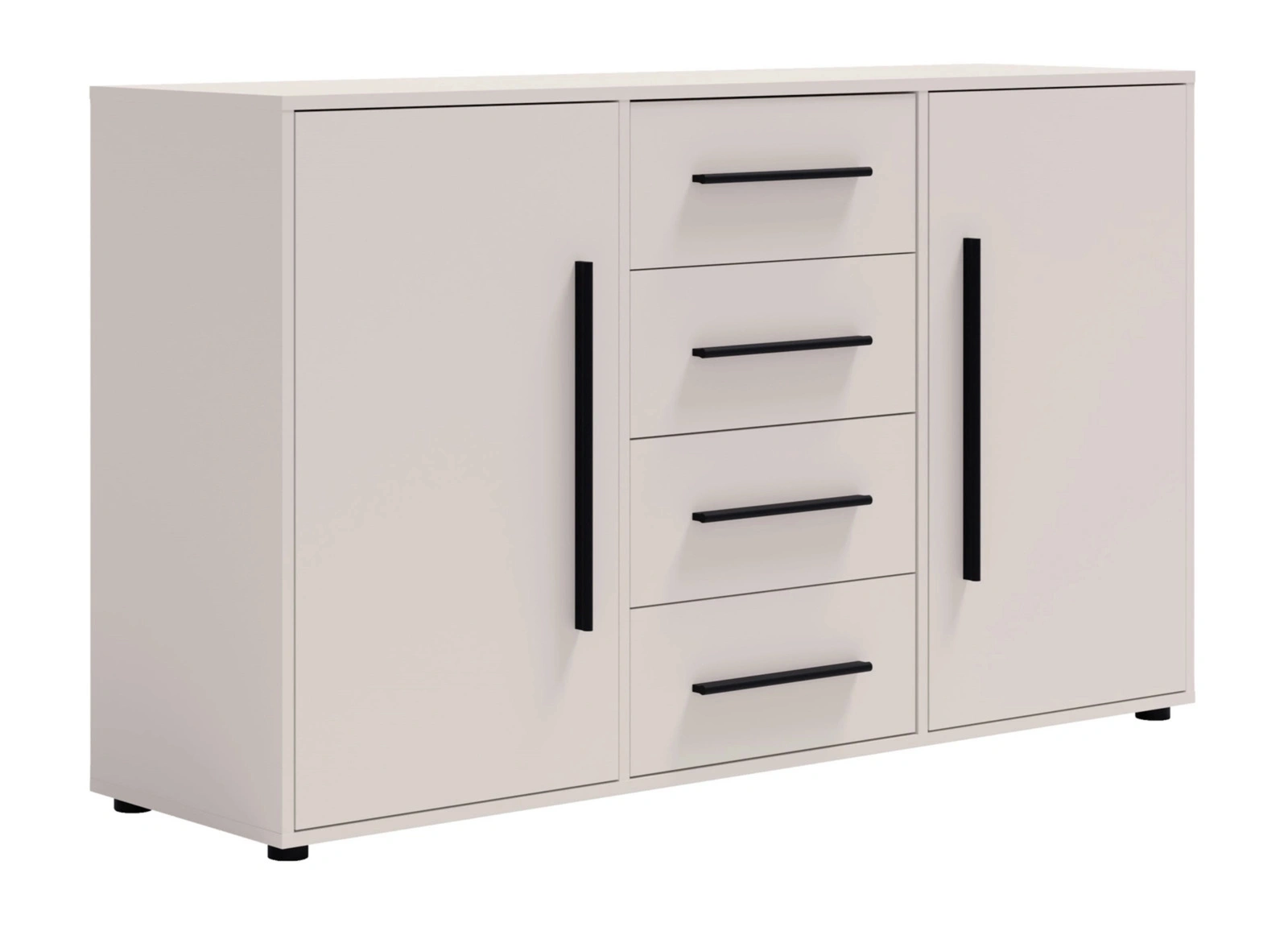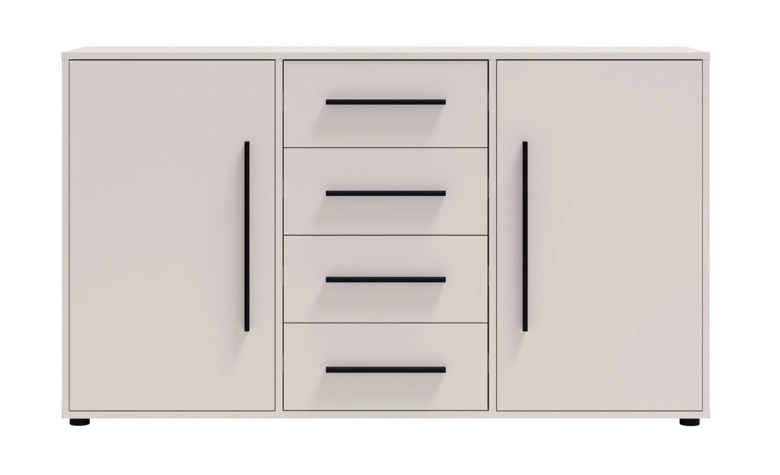 - Komoda w kolorze cashmere Modena z 4 szufladami i 2 szafkami. Nowoczesna, pojemna i uniwersalna – idealna do salonu, sypialni i przedpokoju.