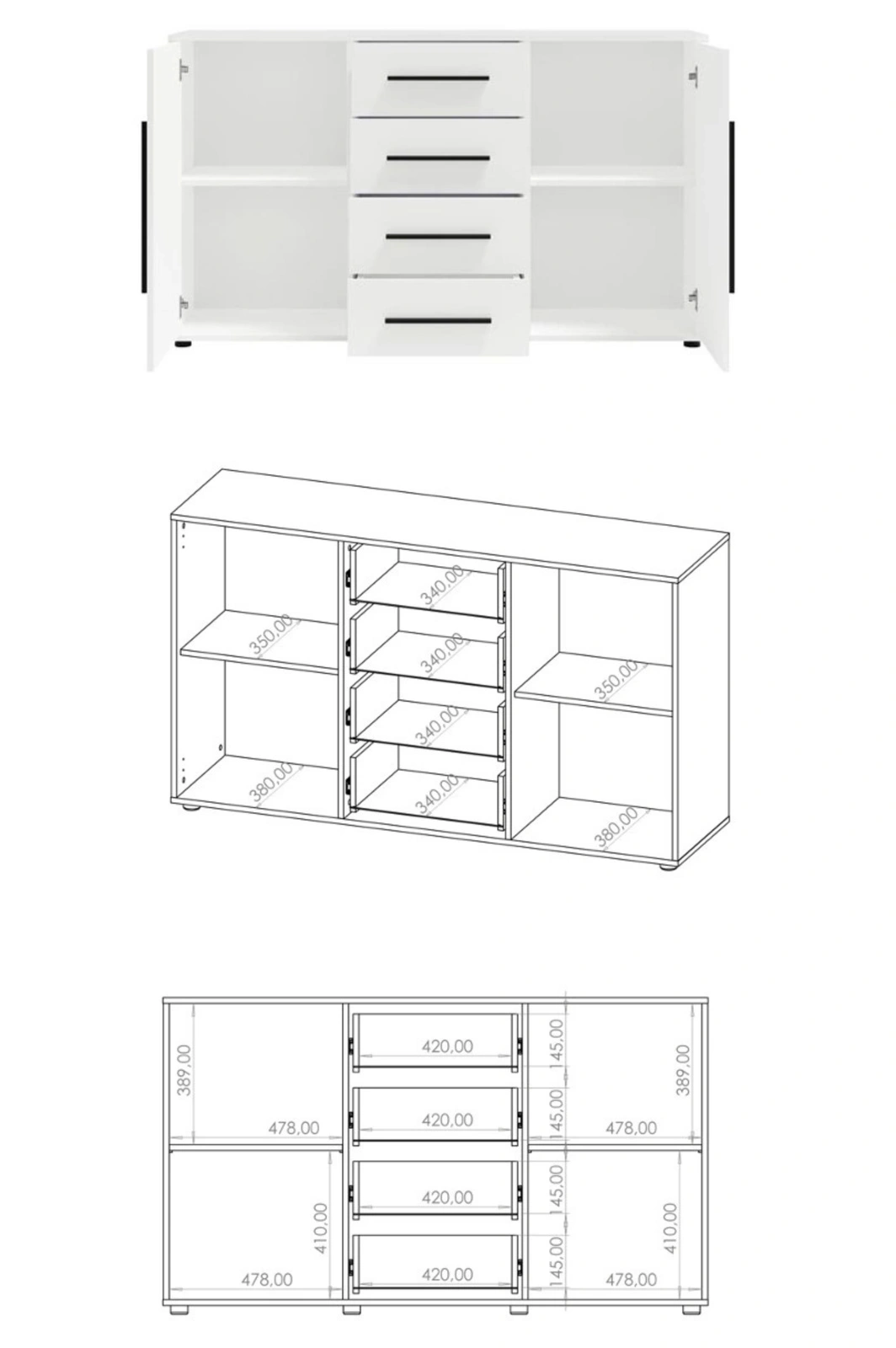 Wyposażona w cztery pojemne szuflady umieszczone centralnie oraz dwie boczne szafki z półkami, komoda zapewnia maksymalną funkcjonalność i komfort przechowywania. Dzięki niej z łatwością zorganizujesz przestrzeń w salonie, sypialni czy przedpokoju, znajdując miejsce na ubrania, bieliznę, dokumenty lub inne domowe akcesoria. Szeroki blat komody to idealna przestrzeń na dekoracje, rośliny, lampki czy ulubione ramki ze zdjęciami, które nadadzą wnętrzu indywidualnego charakteru.