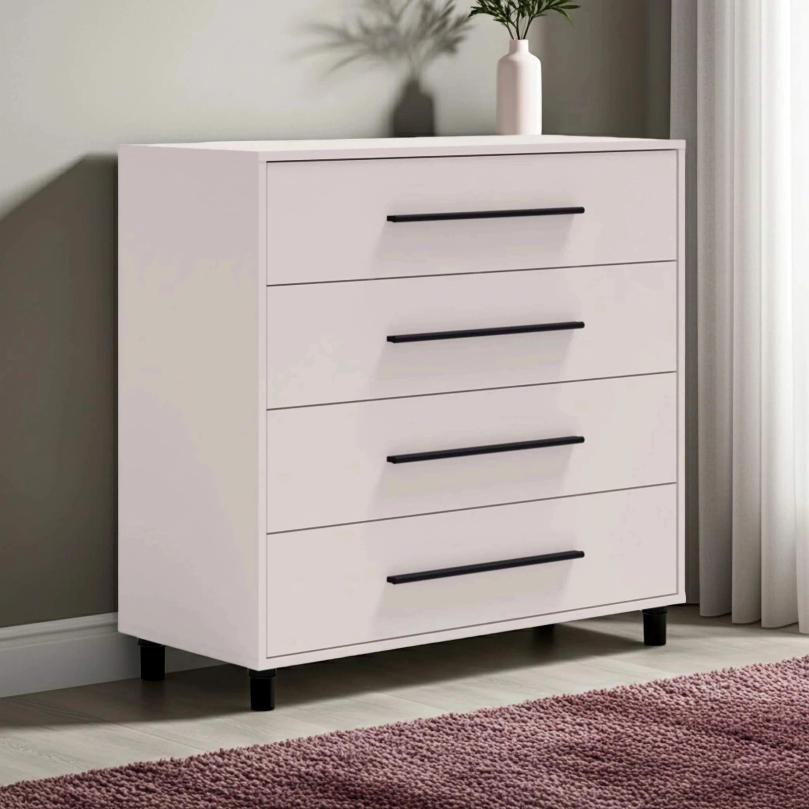 Wyposażona w cztery szerokie i pojemne szuflady, komoda świetnie sprawdzi się w sypialni, salonie czy pokoju młodzieżowym. Bez problemu zmieścisz w niej odzież, bieliznę, dokumenty lub akcesoria, zachowując porządek i mając wszystko pod ręką. Stabilna konstrukcja i solidne prowadnice szuflad zapewniają komfort użytkowania na co dzień, a gładki blat komody to idealne miejsce na dekoracje, ramki ze zdjęciami czy ulubione rośliny.