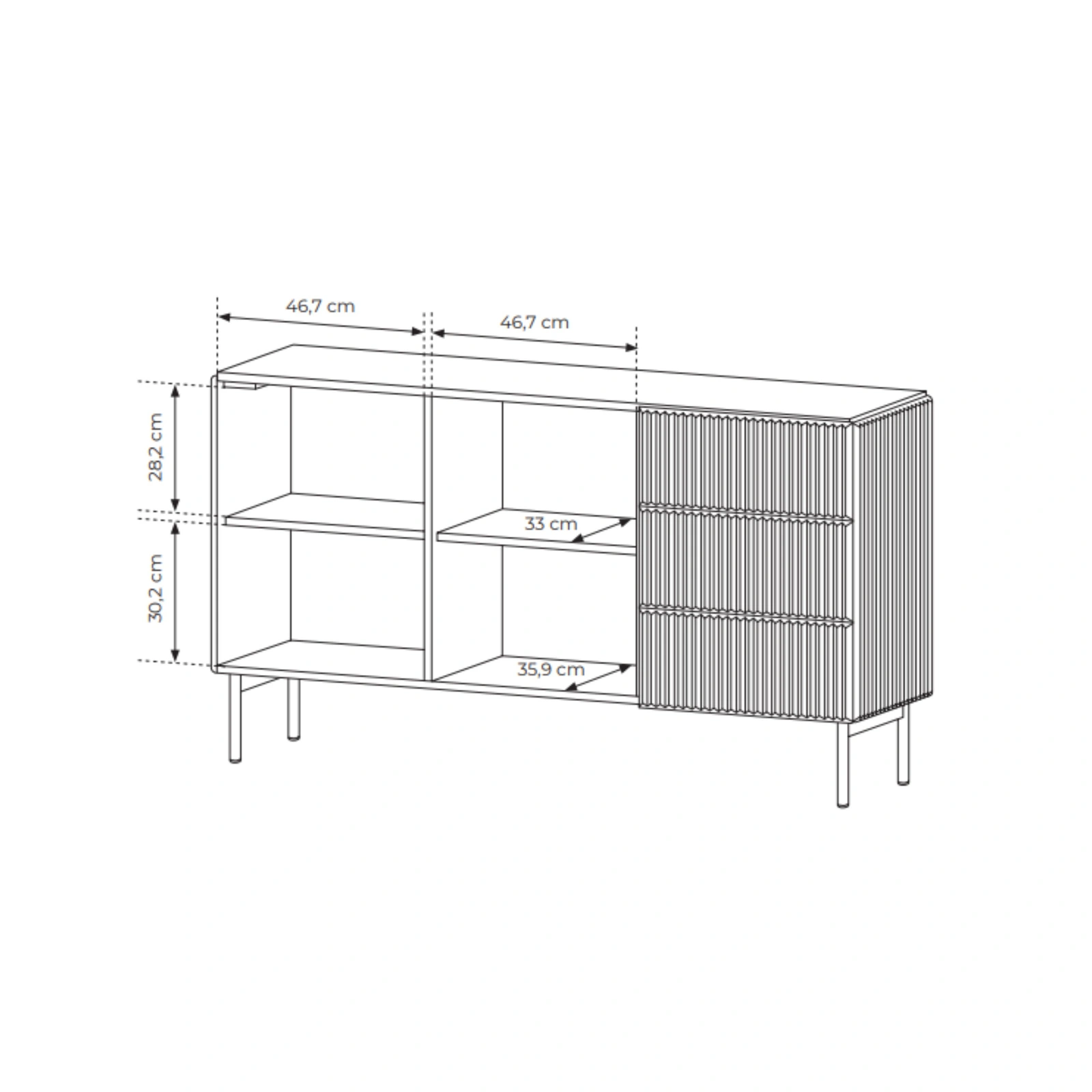 Wyróżnikiem mebla są ryflowane fronty z płyty MDF, które tworzą efektowną, trójwymiarową strukturę. Bryła jest w pełni minimalistyczna – zrezygnowano z uchwytów na rzecz wygodnego systemu Push-to-Open. Całość spoczywa na solidnych, metalowych nóżkach w kolorze czarnym, co nadaje komodzie lekkości.