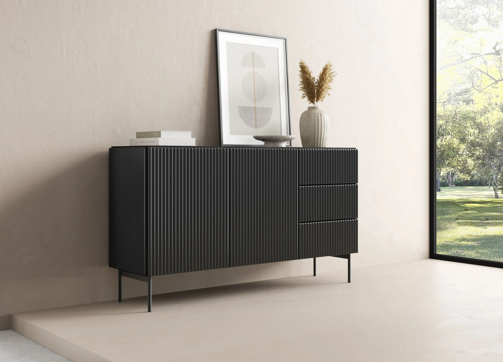 - Kompaktowa komoda MUTI (147 cm) w głębokiej czerni. Posiada 3 szuflady i 2 szafki, oferując świetną organizację w mniejszym rozmiarze. Ryflowane fronty MDF otwierane systemem Push-to-Open. Czarne metalowe nóżki. Idealna do sypialni i salonu