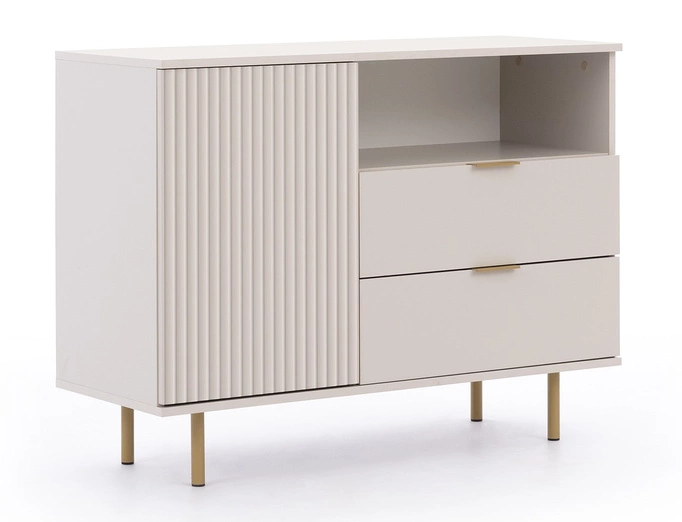 - Kolor w odcieniu Cashmere nadaje komodzie delikatności i harmonii, co czyni ją idealnym meblem do różnych rodzajów wnętrz. Rozmiary (szerokość 107 cm, wysokość 80 cm, głębokość 41 cm) sprawiają, że doskonale sprawdzi się w mniejszych pomieszczeniach.