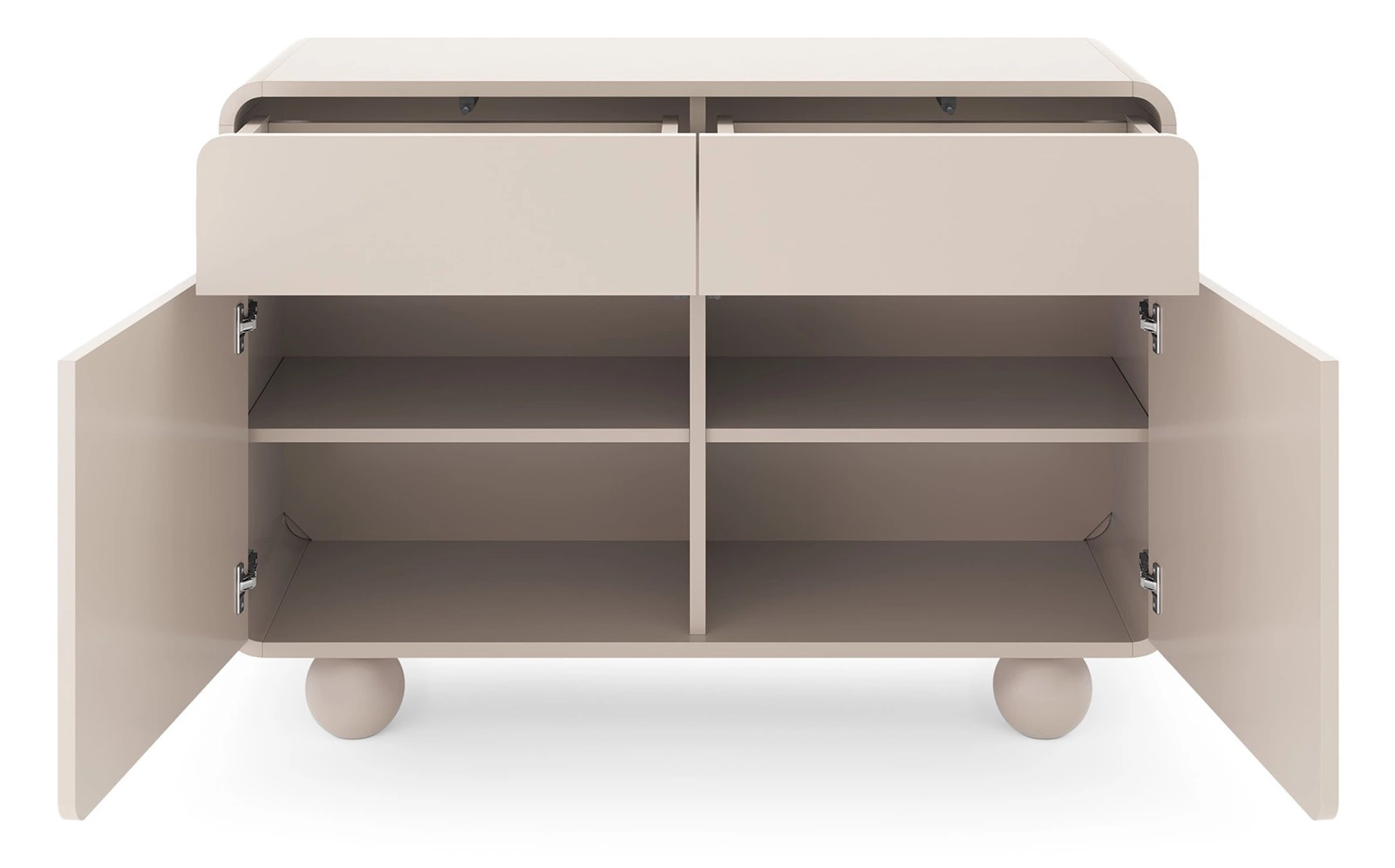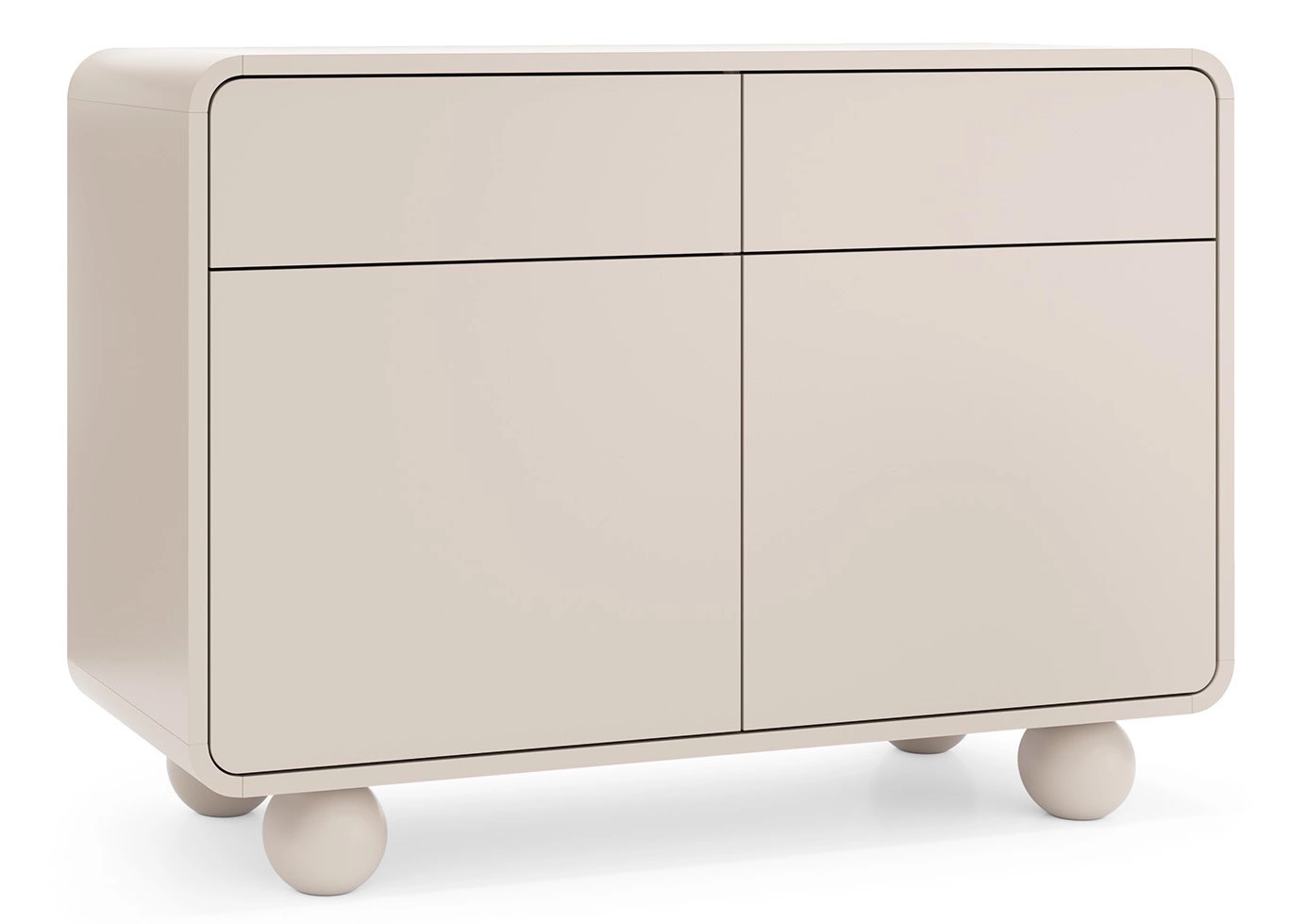 - Komoda Orion w kolorze kaszmir to nowoczesny mebel na kulistych nóżkach. Wyposażona w dwie szuflady i pojemne półki za drzwiami, łączy funkcjonalność z designerskim wyglądem.