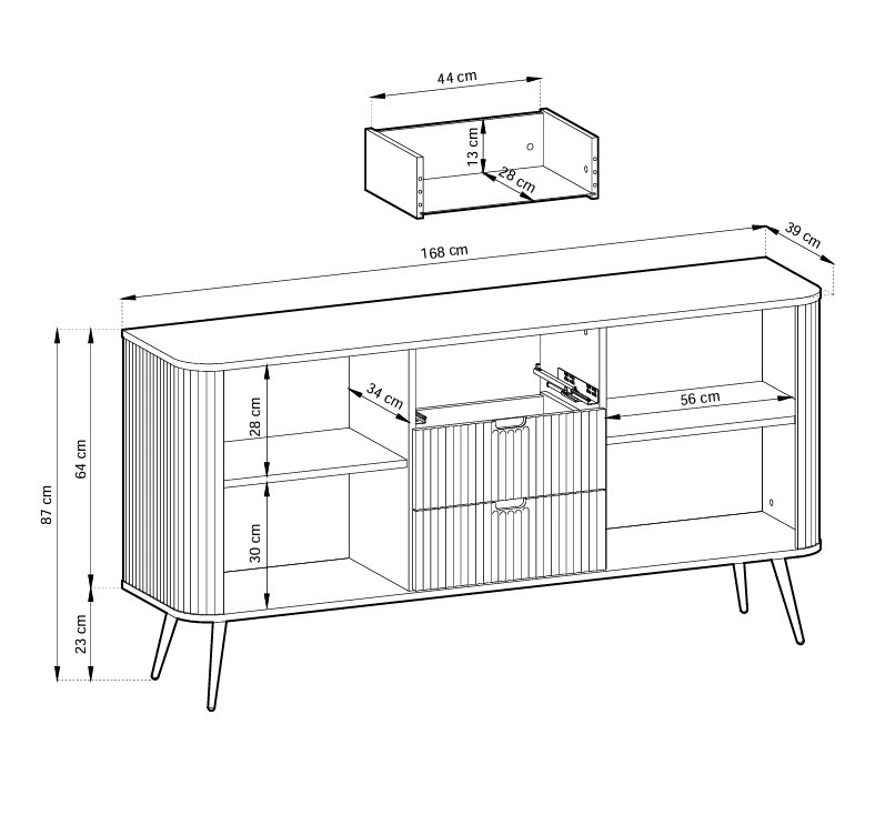 Wyposażona w dwie pojemne szafki i trzy centralne szuflady, oferuje mnóstwo miejsca do przechowywania – idealna na dokumenty, tekstylia, akcesoria czy drobiazgi codziennego użytku. Delikatnie zaokrąglone krawędzie oraz smukłe, czarne nóżki nadają meblowi lekkości i nowoczesnego charakteru.