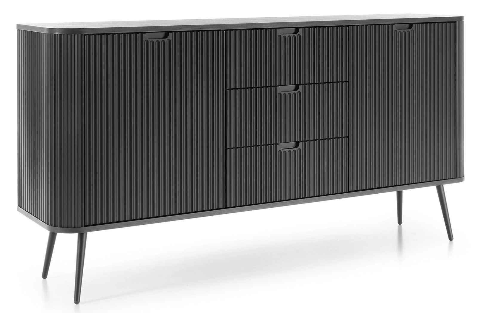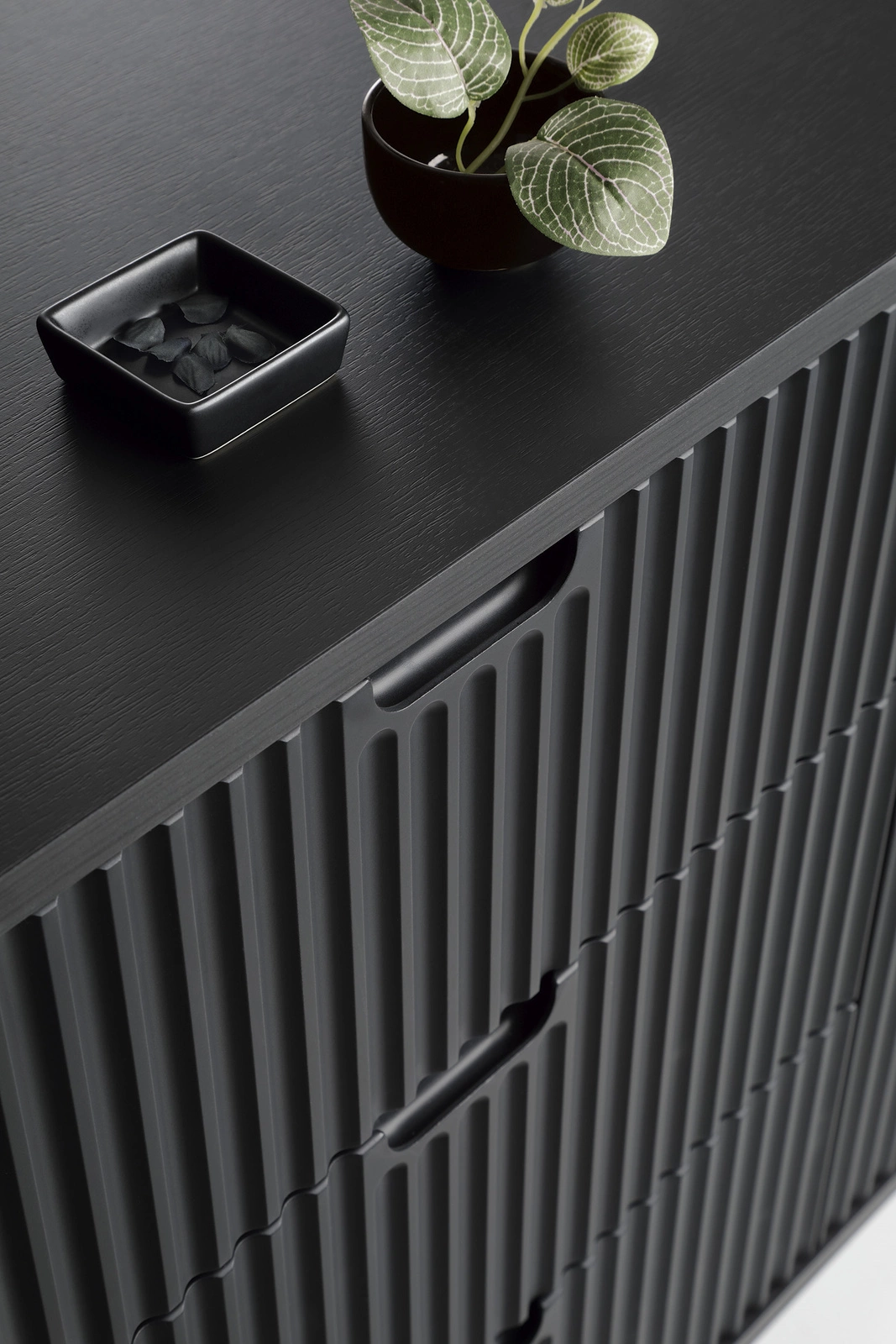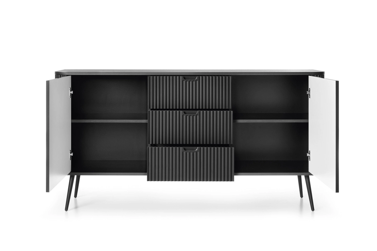 Komoda PORTO w kolorze czarnym to nowoczesny mebel, który łączy w sobie minimalistyczny design z praktycznymi rozwiązaniami. Jej unikalne, pionowe żłobienia na frontach dodają elegancji i przyciągają wzrok, czyniąc z niej stylowy element każdego wnętrza – od salonu, przez sypialnię, po przedpokój.
