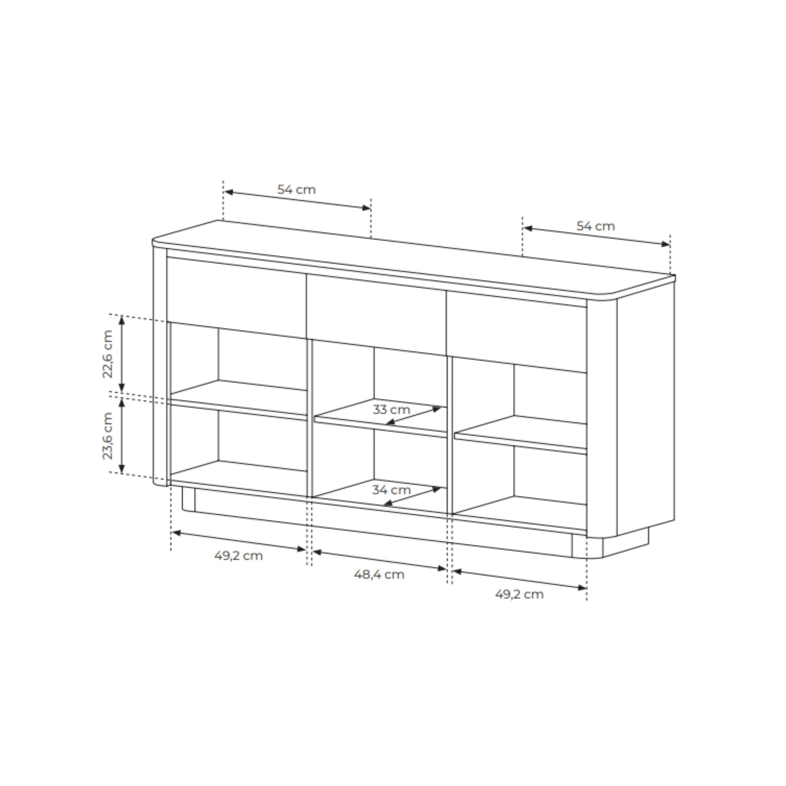 • 3 zamykane szafki: Przestrzeń z półkami na większe rzeczy, takie jak odzież, zastawa stołowa czy segregatory.