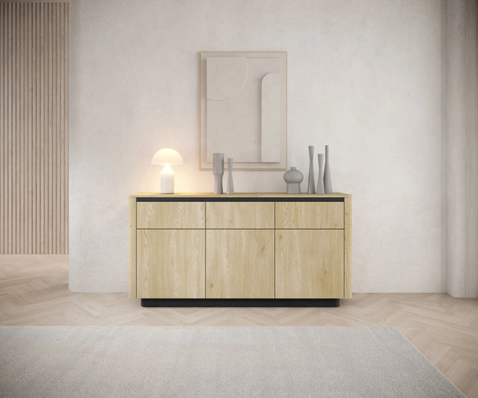 Komoda z kolekcji TORRO o szerokości 163,2 cm to mebel, który łączy funkcjonalność z wyjątkowym designem. Ciepły odcień Dąb Cremona zestawiony z czarnymi akcentami (cokół, listwa podblatowa, wstawki) tworzy elegancką, nowoczesną całość, która pasuje zarówno do wnętrz loftowych, jak i tych bardziej przytulnych.
