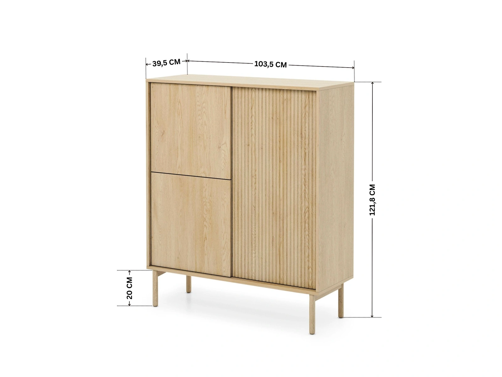 - Stylowa komoda wysoka TAVO (104 cm) w kolorze dąb cremona. Wyróżnia się ryflowanymi frontami MDF i solidnymi drewnianymi nóżkami. Minimalistyczna forma bez uchwytów (Push-to-Open). Wnętrze z półkami. Idealna do salonu w stylu boho lub japandi.