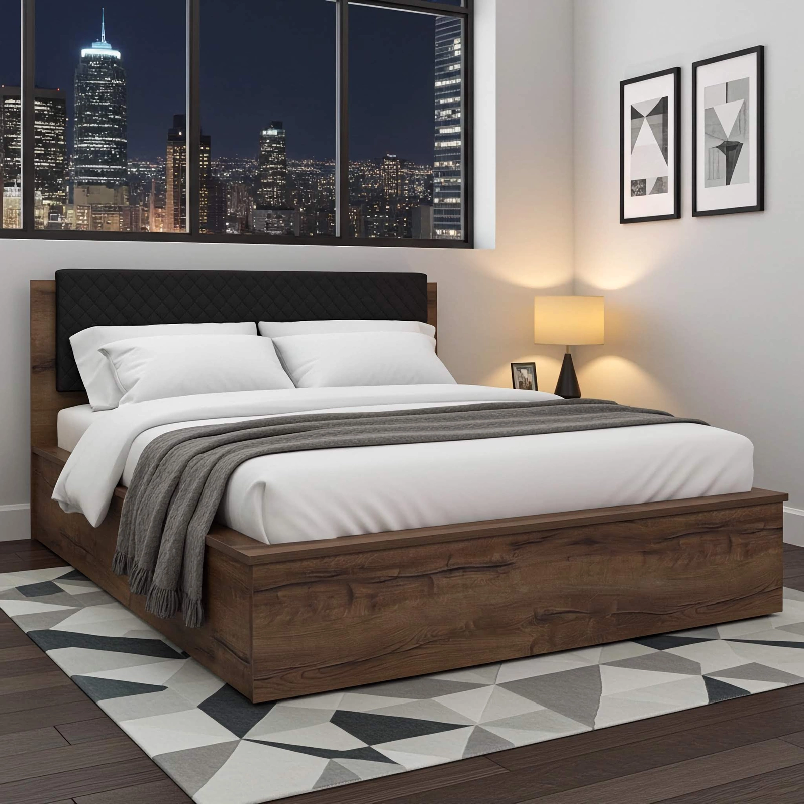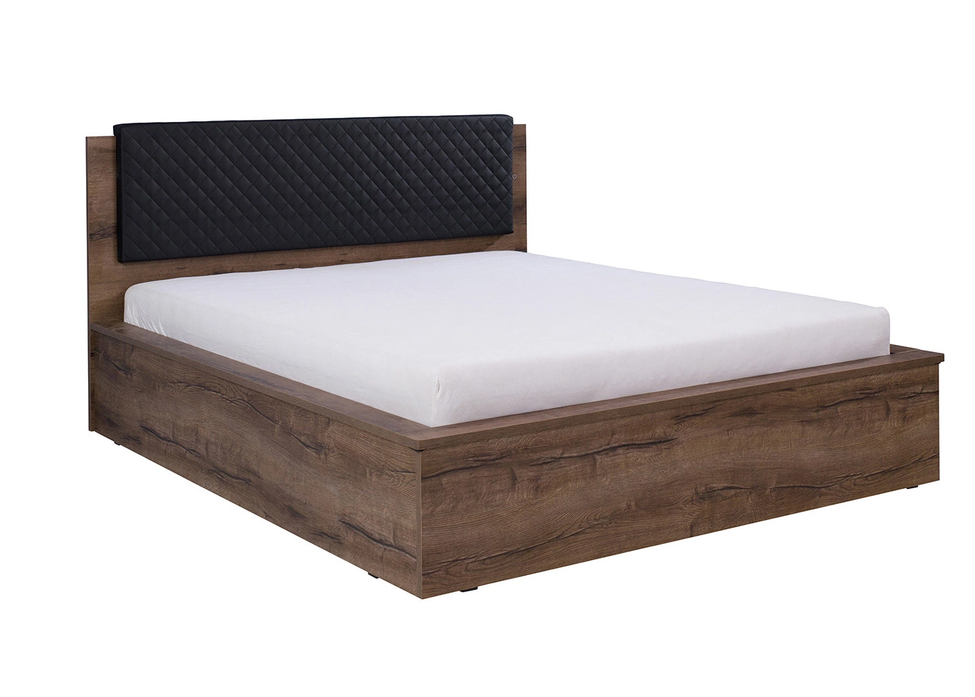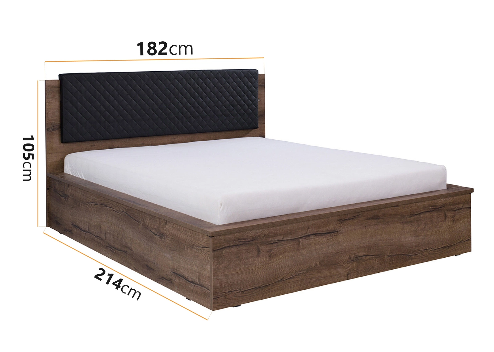 - Komfortowe łóżko w kolorze Dąb Monastery / Czarna pikowana ekoskóra szerokość 182 cm powierzchnia spania 160x200 cm – idealny do sypialni, wprowadzi przytulny klimat do wnętrza.