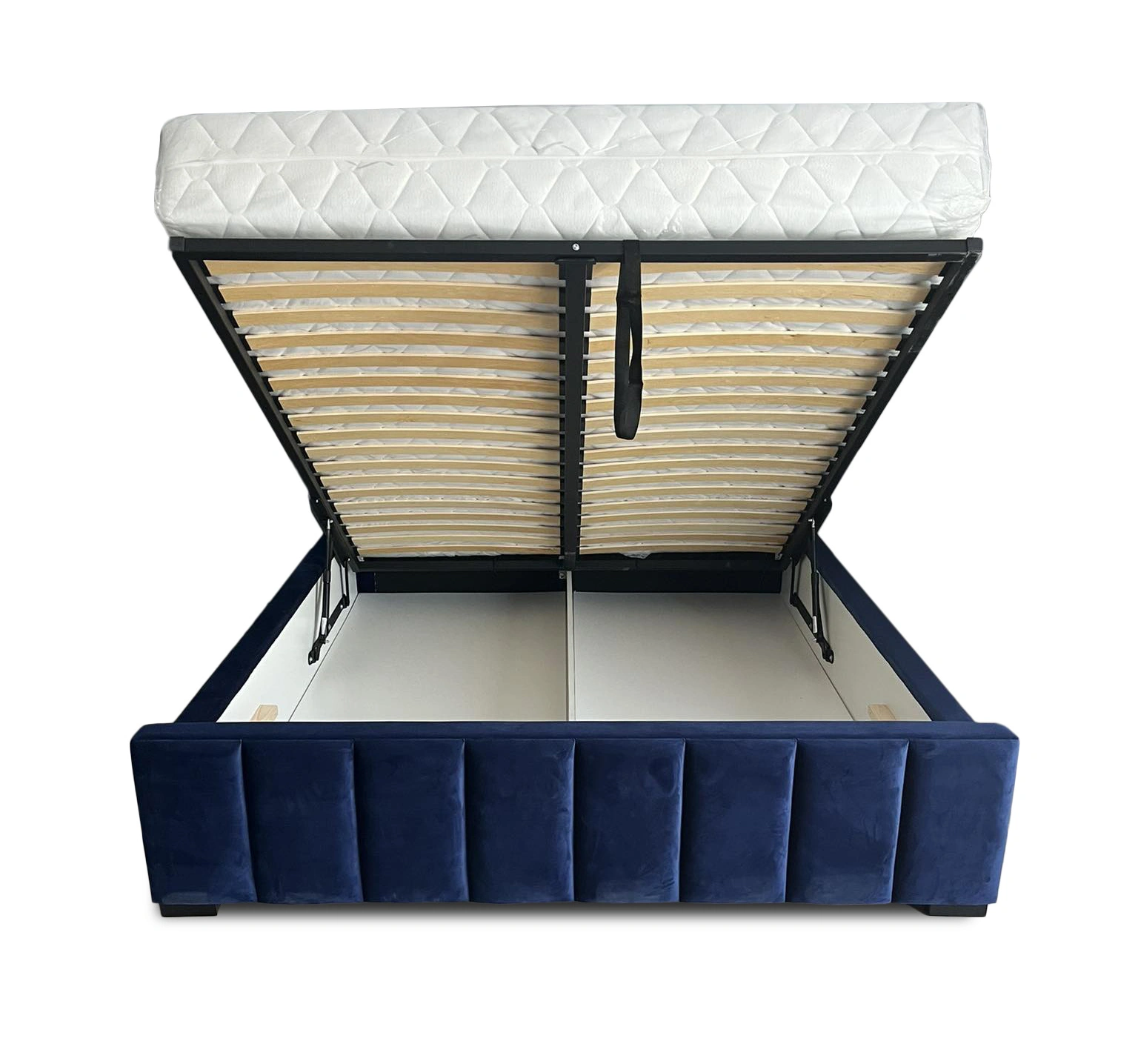 - Łóżko TODI (140x200) w królewskim granacie. Luksusowy wygląd i wygoda. Tkanina welurowa o luksusowym połysku. Posiada metalowy stelaż (36 listew) na podnośnikach gazowych oraz dwa pojemne schowki na pościel.