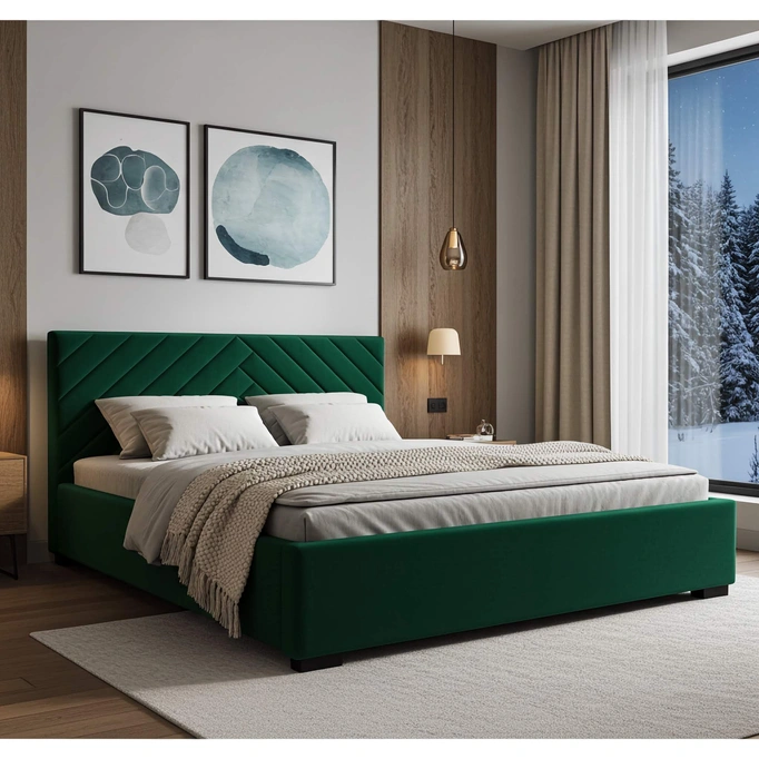 Wprowadź do swojej sypialni energię lasu i spokój natury. Łóżko TODI w odcieniu butelkowej zieleni to absolutny hit wnętrzarski, który idealnie komponuje się ze stylem Urban Jungle oraz złotymi dodatkami. Ten szlachetny, głęboki kolor działa kojąco na zmysły, a welurowa tkanina wydobywa z niego niezwykłą głębię. To mebel dla osób, które chcą stworzyć unikalną, nastrojową przestrzeń do odpoczynku, z dala od zgiełku miasta.