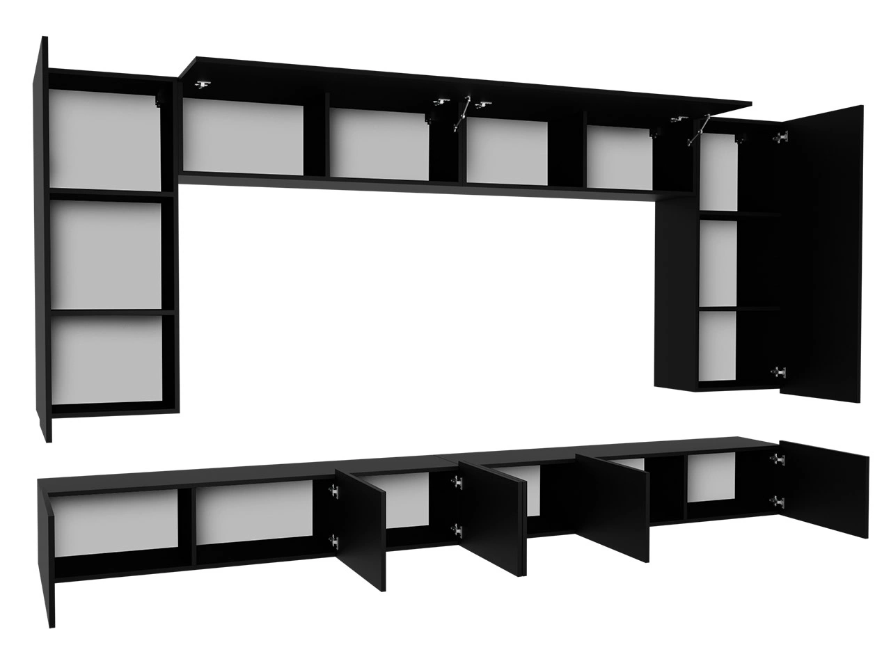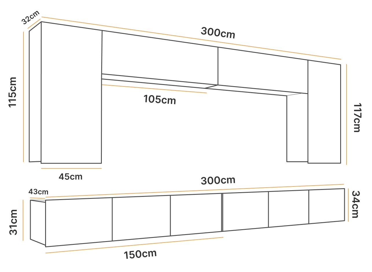 Zestaw składa się z dwóch szafek wiszących pionowych oraz dwóch poziomych, a także przestronnych szafek RTV o szerokości 150 cm, co zapewnia mnóstwo miejsca do przechowywania. Całkowita szerokość meblościanki wynosi 300 cm, co czyni ją idealnym rozwiązaniem do większych pomieszczeń.