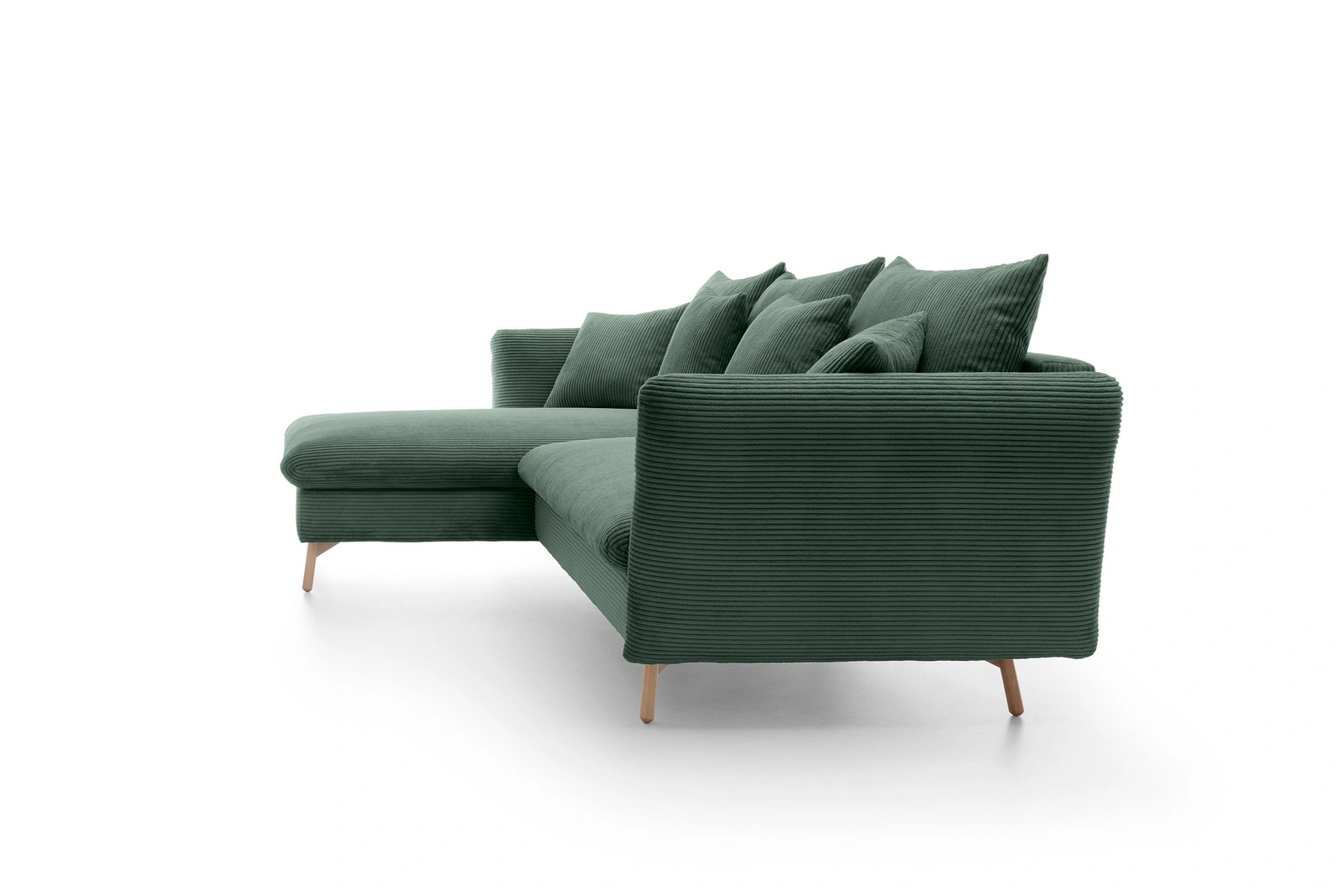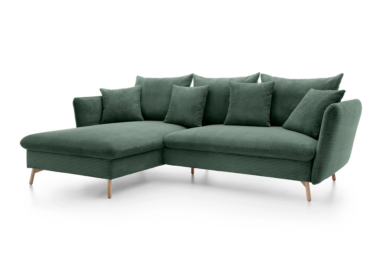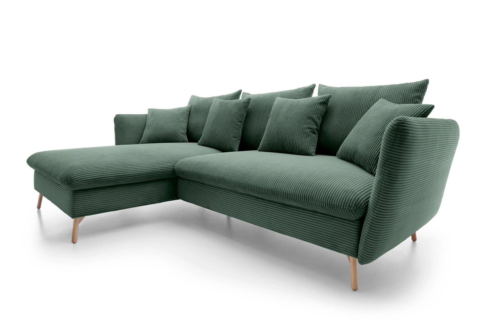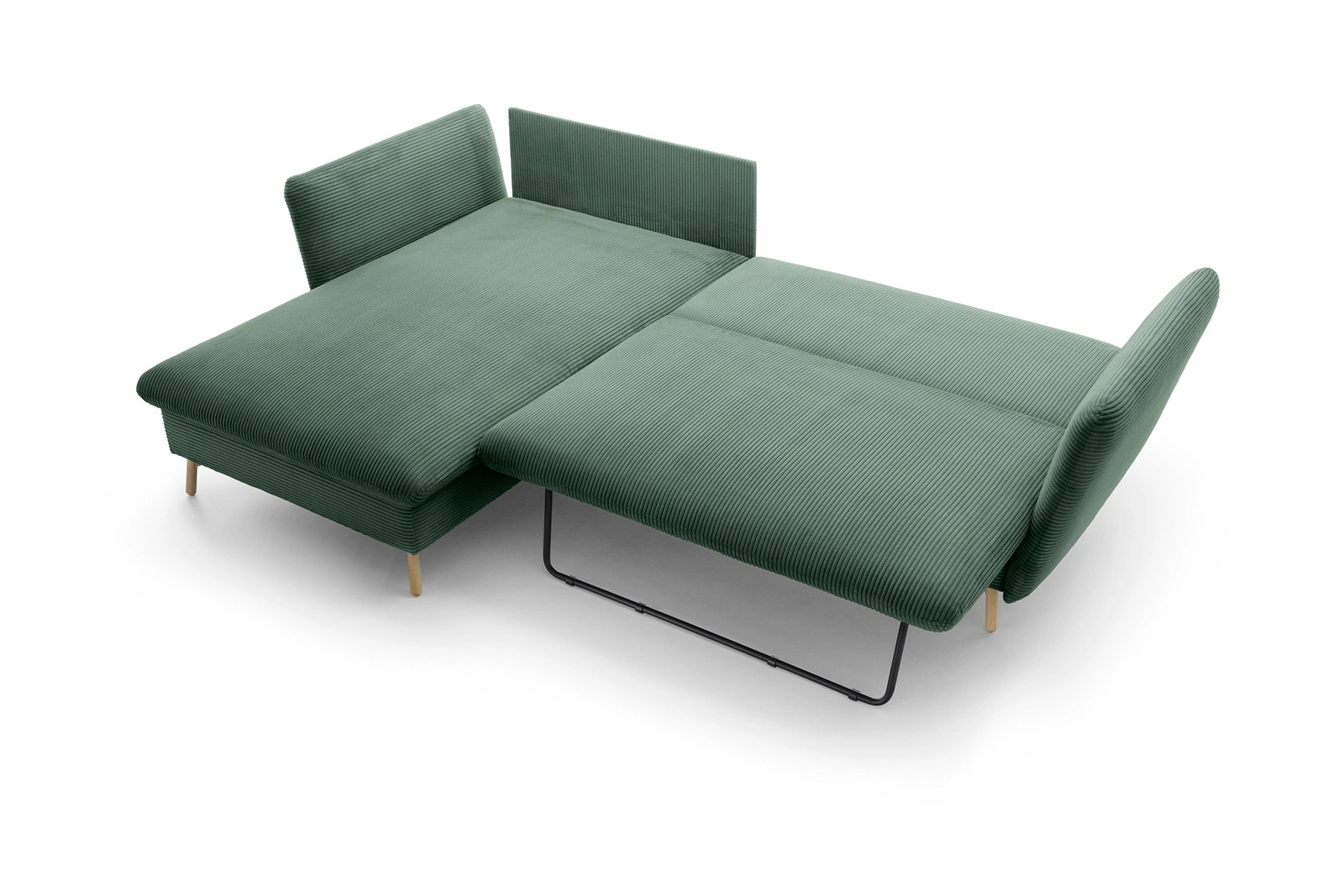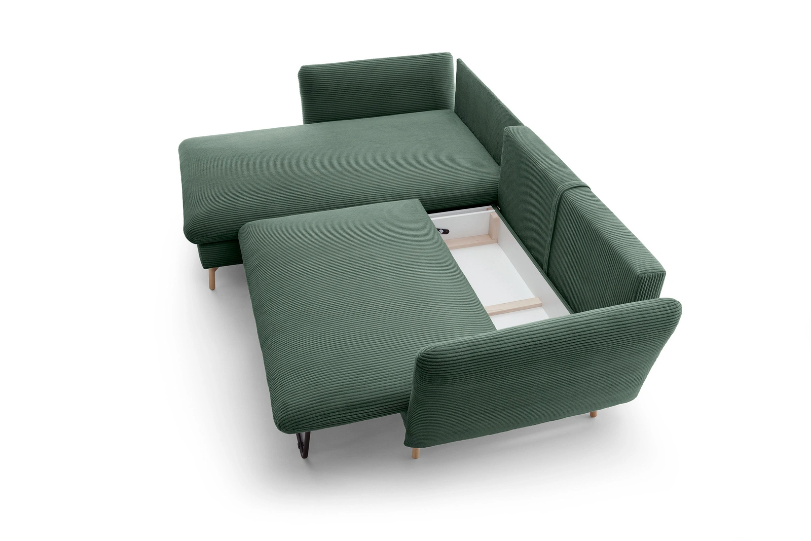 - Narożnik MORRE (Poso 14, butelkowa zieleń) to elegancja w grubym sztruksie. Wersja lewostronna z funkcją spania i pojemnikiem. Głęboka zieleń i wysokie drewniane nóżki tworzą stylowy duet. Wymiary: 258x167 cm.