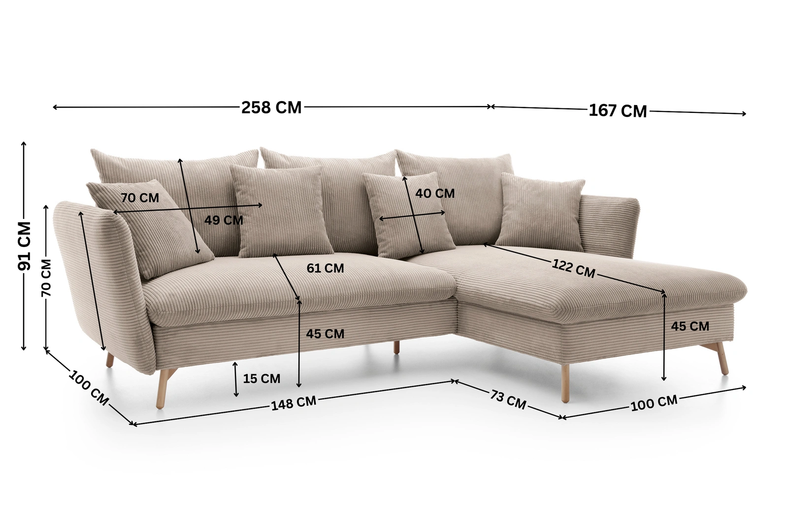 - Nowoczesny narożnik MORRE w modnej tkaninie sztruksowej Poso 02 (ciepły beż). Mebel w stylu skandynawskim na wysokich, drewnianych nóżkach. Posiada funkcję spania oraz pojemnik na pościel.