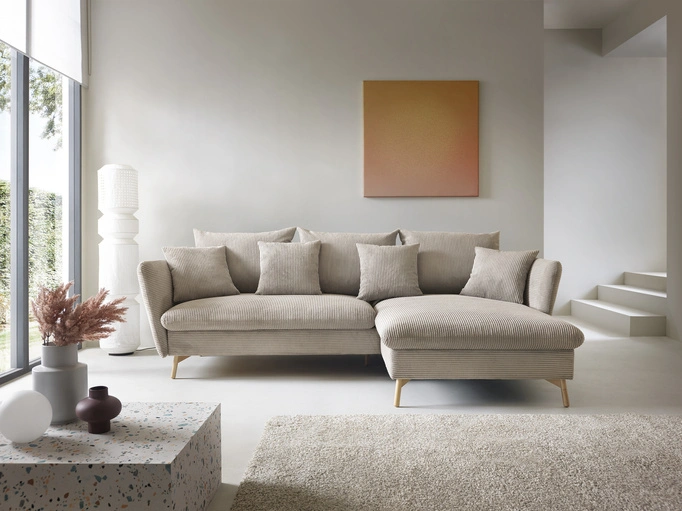 Narożnik MORRE prawostronny sztruks Poso 02 beżowy funkcja spania skandynawski