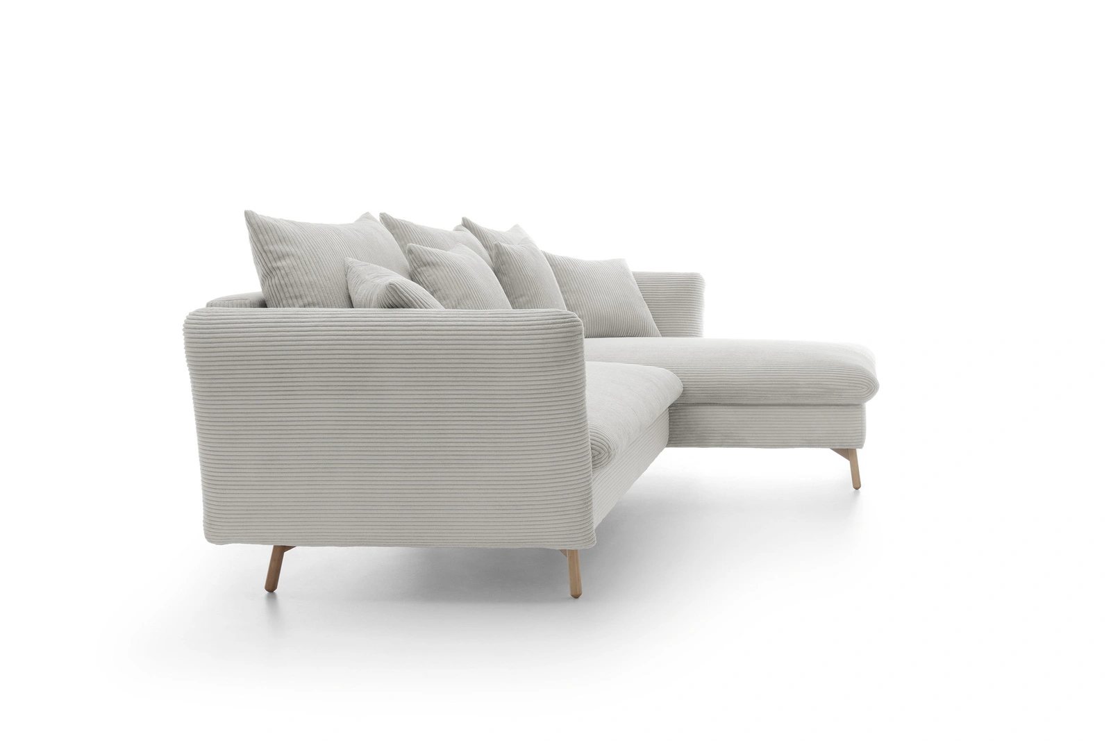 Pragniesz rozświetlić swój salon i nadać mu lekkości? Narożnik MORRE w kolorze kremowym (Poso 100) to esencja stylu Japandi i Boho. Jego zgrabna bryła w kształcie litery L (wersja prawostronna), osadzona na wysokich drewnianych nóżkach, została ubrana w modny, gruby sztruks w najjaśniejszym odcieniu, dzięki czemu wnętrze wydaje się większe i bardziej przestronne.