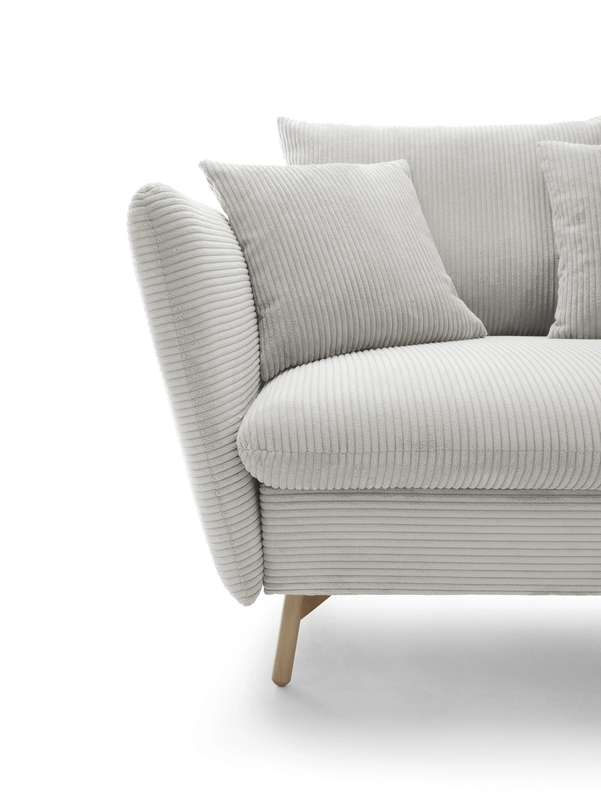 To właśnie tapicerka czyni ten mebel tak efektownym. Tkanina Poso 100 to gruby welur o strukturze wyrazistego sztruksu w odcieniu złamanej bieli.