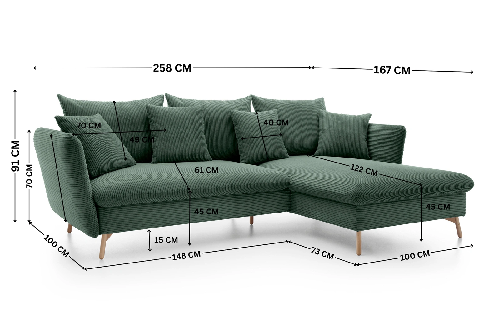 - Narożnik MORRE (Poso 14, butelkowa zieleń) to elegancja w grubym sztruksie. Wersja prawostronna z funkcją spania i pojemnikiem. Głęboka zieleń i wysokie drewniane nóżki tworzą stylowy duet. Wymiary: 258x167 cm.