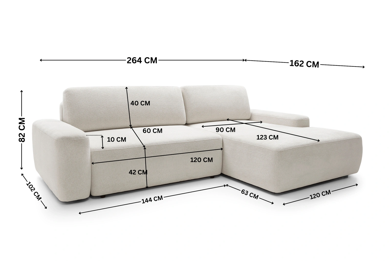 - Szeroki szezlong: Boczna część mebla (162 cm głębokości) to idealne miejsce na popołudniową drzemkę lub wieczorny seans filmowy.