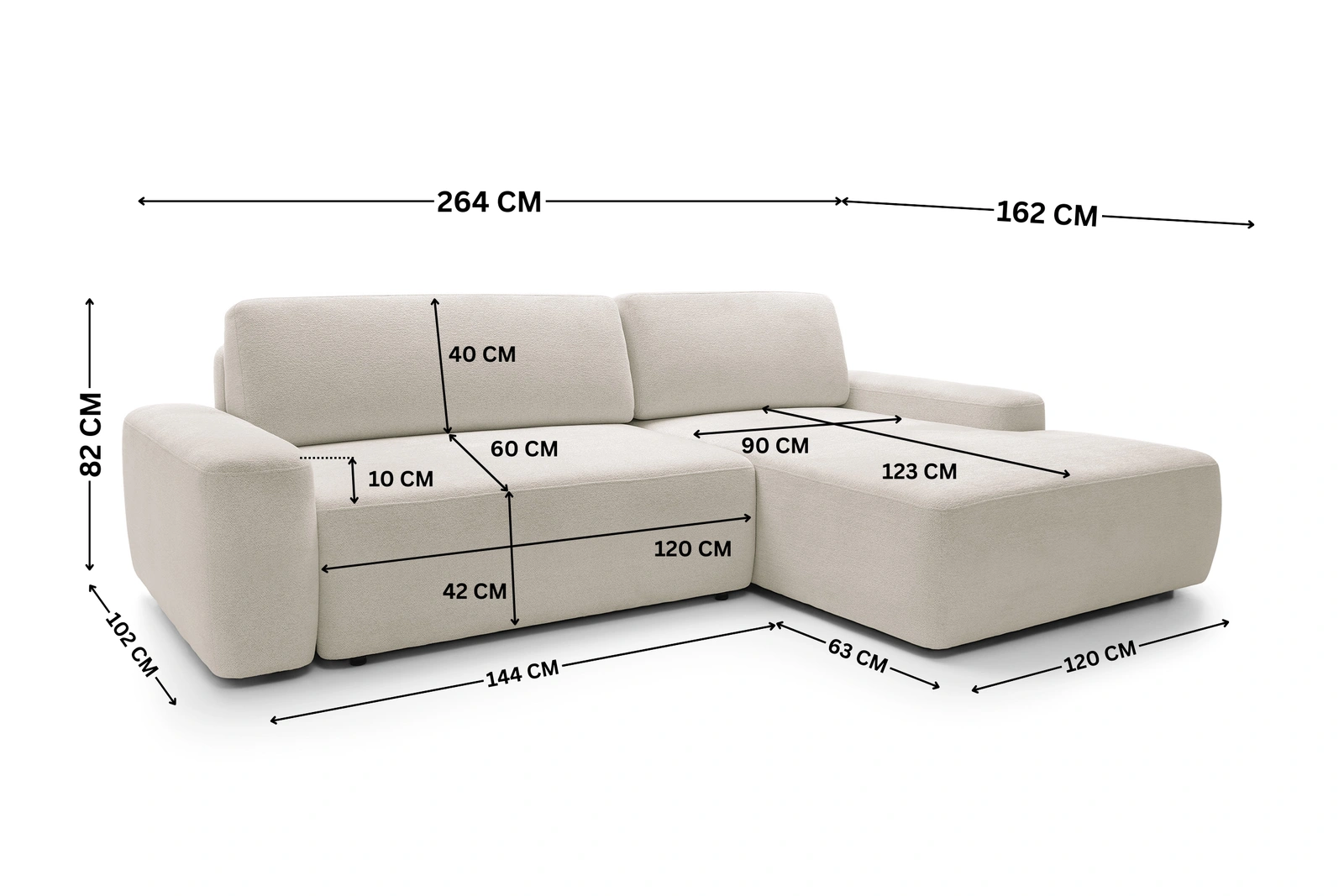 - Szeroki szezlong: Boczna część mebla (162 cm głębokości) to idealne miejsce na popołudniową drzemkę lub wieczorny seans filmowy.