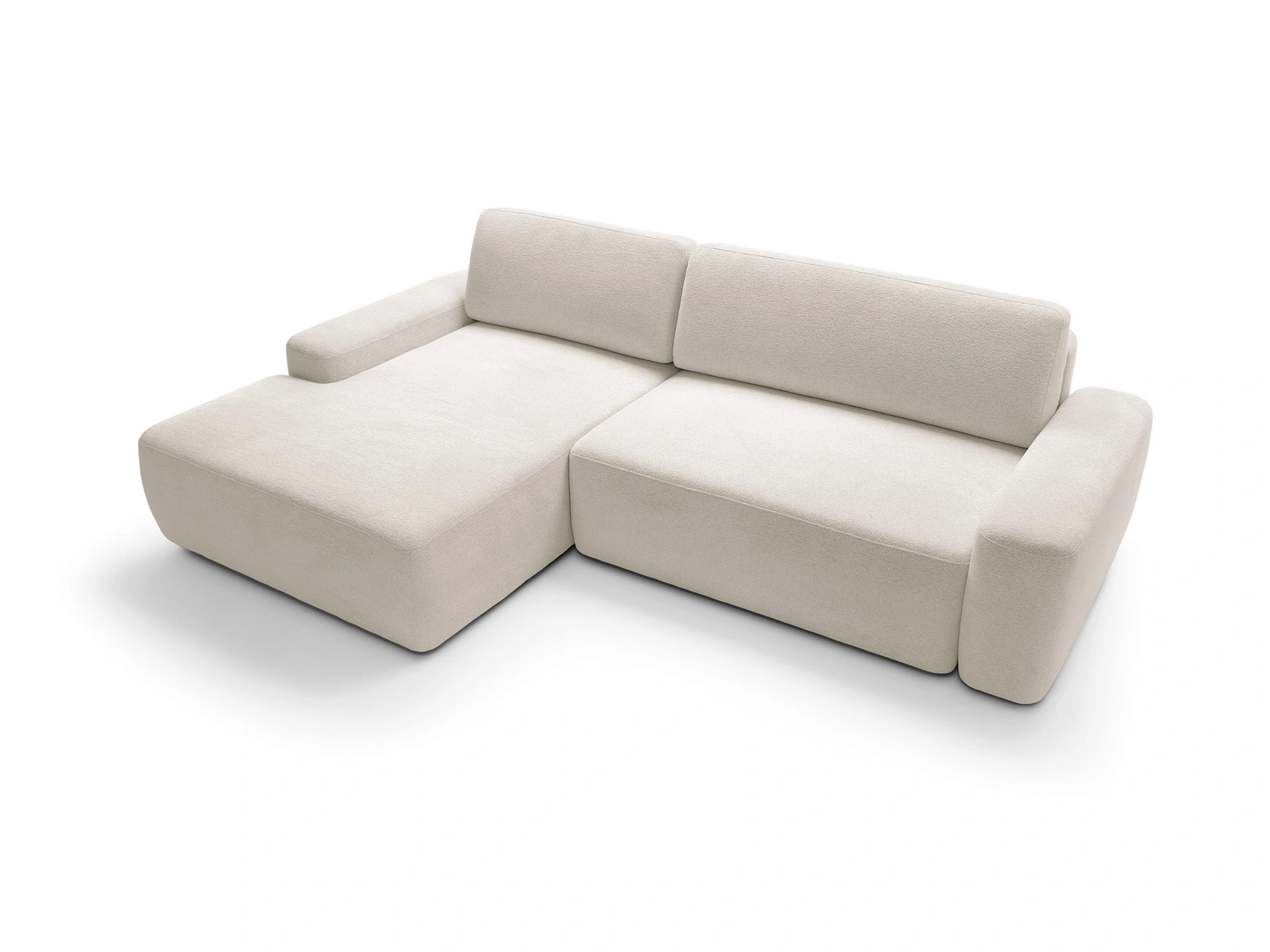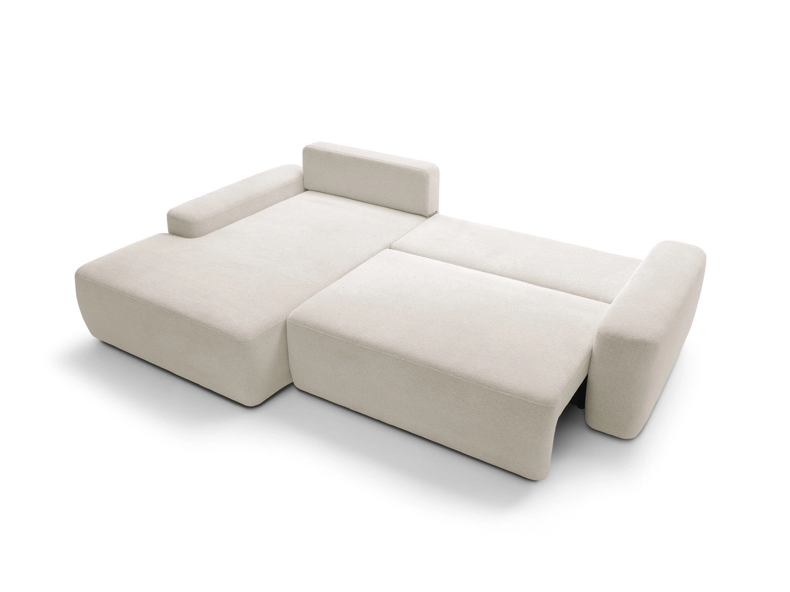 - Nowoczesny narożnik typu "soft" o miękkiej, zaokrąglonej linii. Utrzymany w przytulnym, kremowym odcieniu, który wprowadza do wnętrza ciepło i harmonię. Mebel wolnostojący, wyposażony w wygodną funkcję spania oraz pojemnik na pościel.