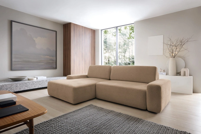 OLMI M to Twoja strefa relaksu. Masywne, głębokie siedziska zapewniają wyjątkową wygodę, a miękka w dotyku tkanina sprawia, że każdy wieczór spędzony na narożniku staje się przyjemnością.