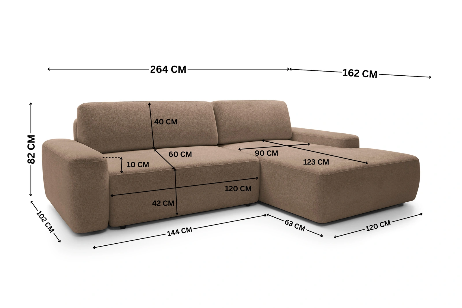 - Szeroki szezlong: Boczna część mebla (162 cm głębokości) to idealne miejsce na popołudniową drzemkę lub wieczorny seans filmowy.