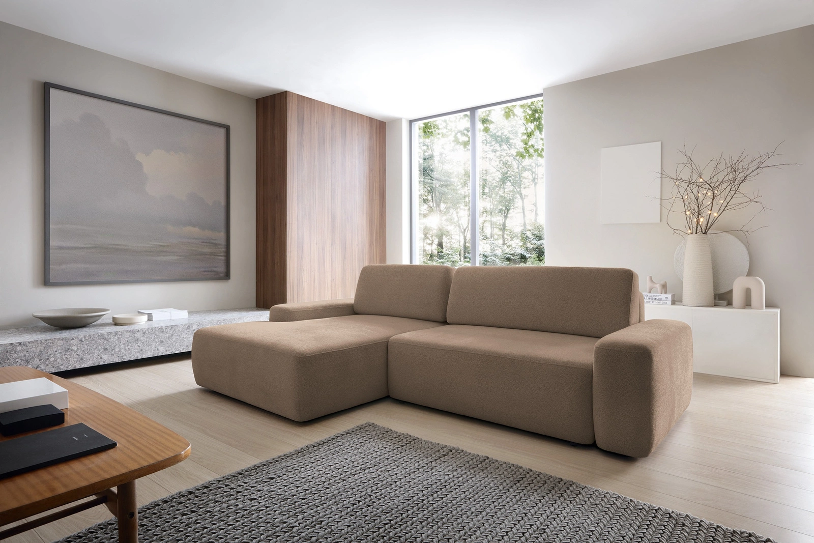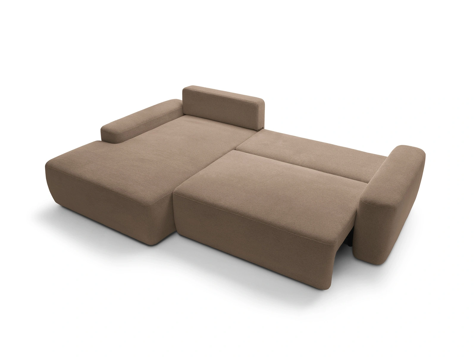 - Luksusowy narożnik wypoczynkowy o modnej, zaokrąglonej bryle. Utrzymany w głębokim, ciemnobrązowym kolorze, który dodaje wnętrzu elegancji i charakteru. Mebel wolnostojący, wyposażony w funkcję spania oraz pojemnik na pościel.