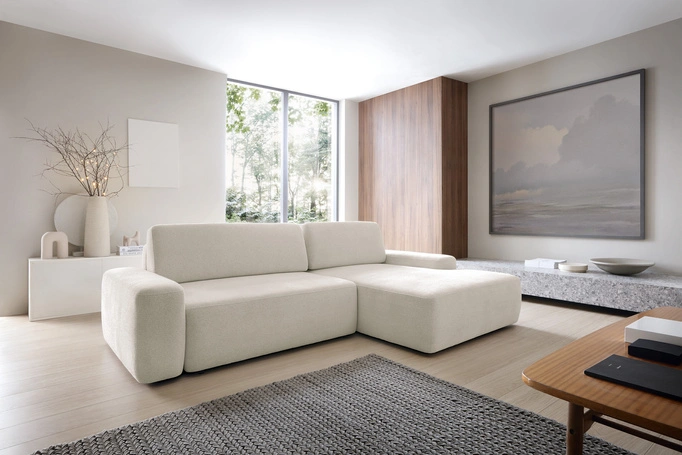 - Nowoczesny narożnik typu "soft" o miękkiej, zaokrąglonej linii. Utrzymany w przytulnym, kremowym odcieniu, który wprowadza do wnętrza ciepło i harmonię. Mebel wolnostojący, wyposażony w wygodną funkcję spania oraz pojemnik na pościel.