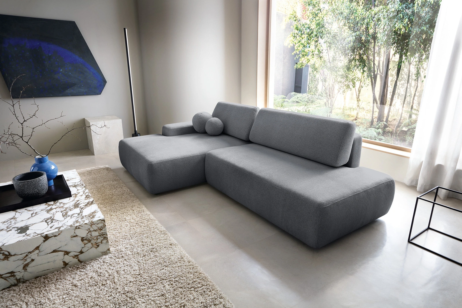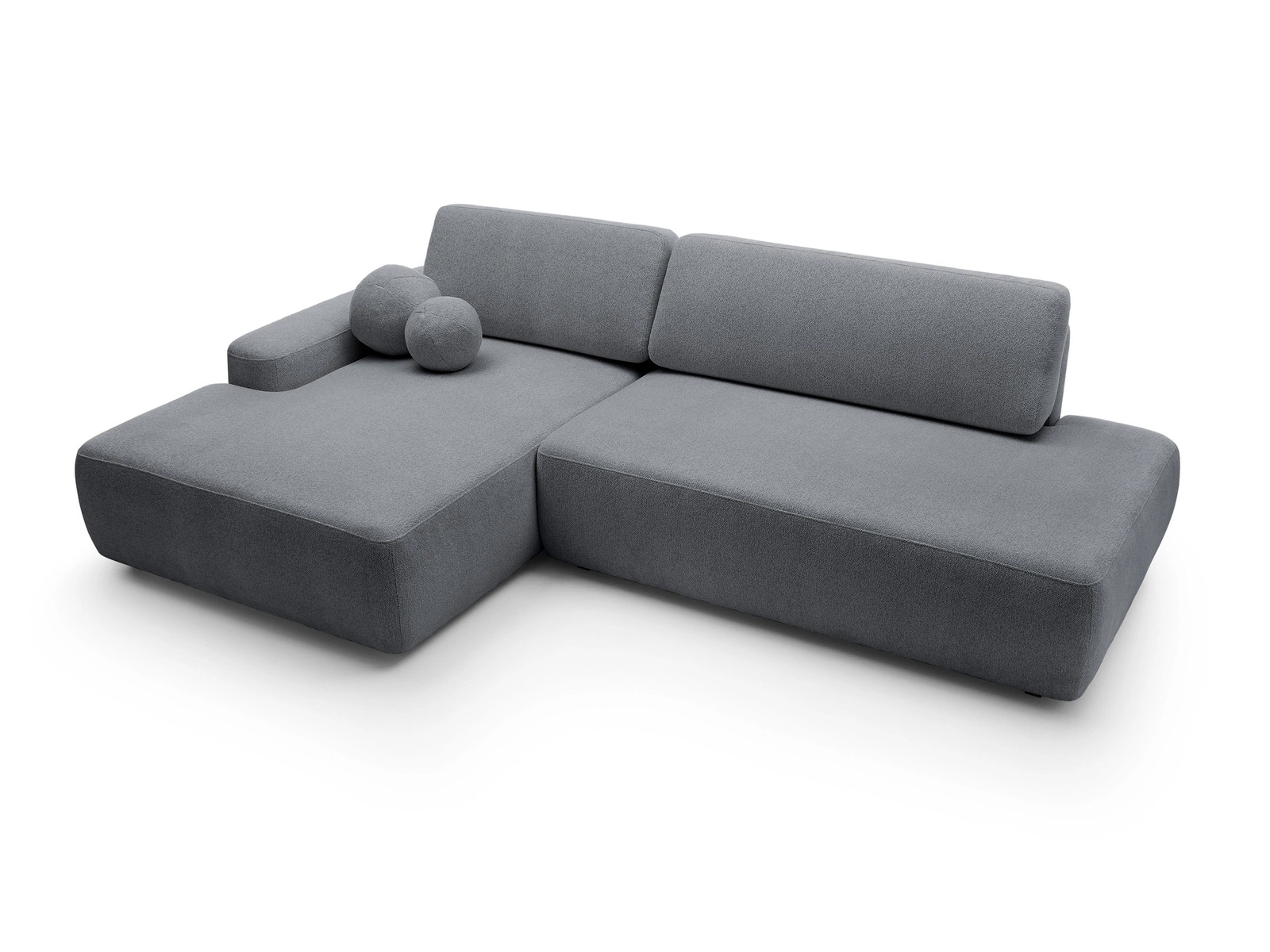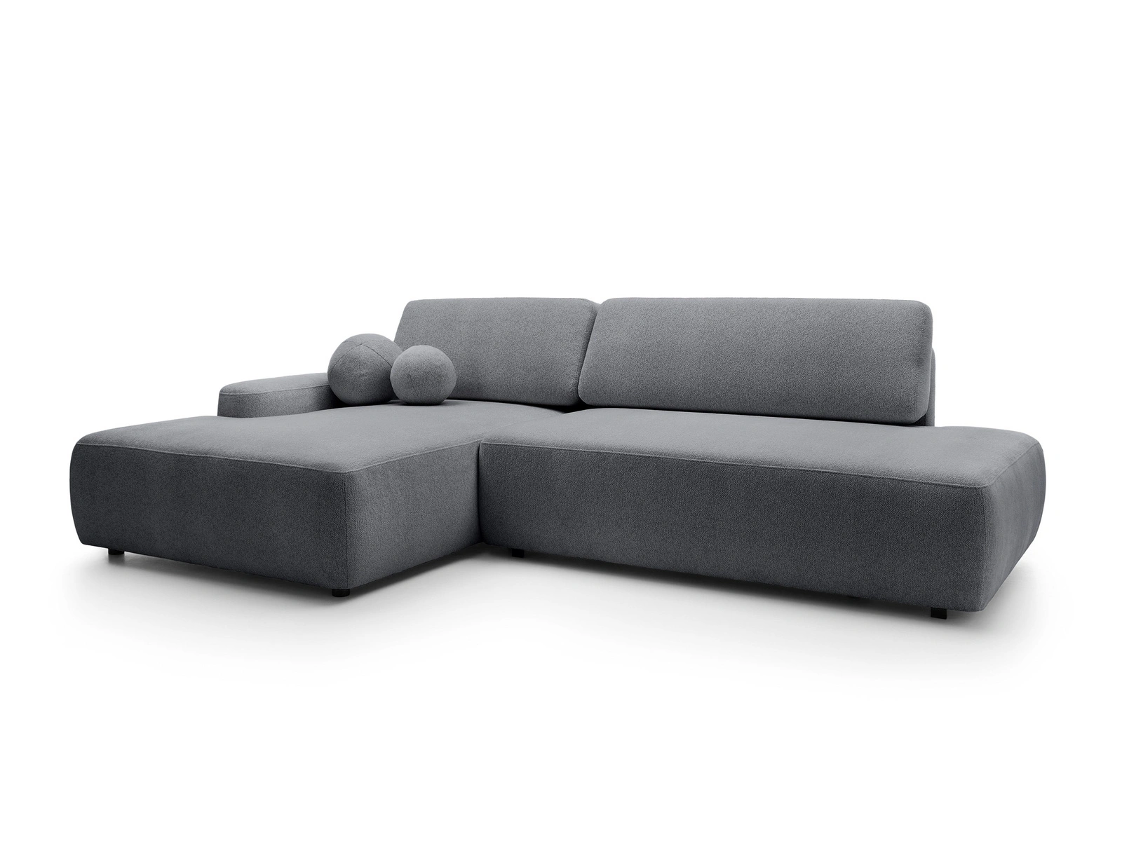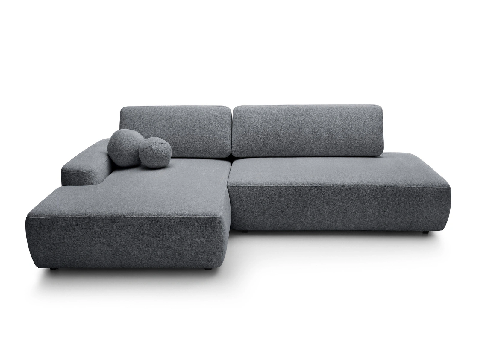 - Narożnik OLMI O (Raven 18, grafit) to nowoczesny design w powiększonym formacie. Szerokość 276 cm, szeroki szezlong i ozdobne poduszki kulki w zestawie. Posiada funkcję spania (210x125 cm) i pojemnik. Tkanina Raven 400g/m².