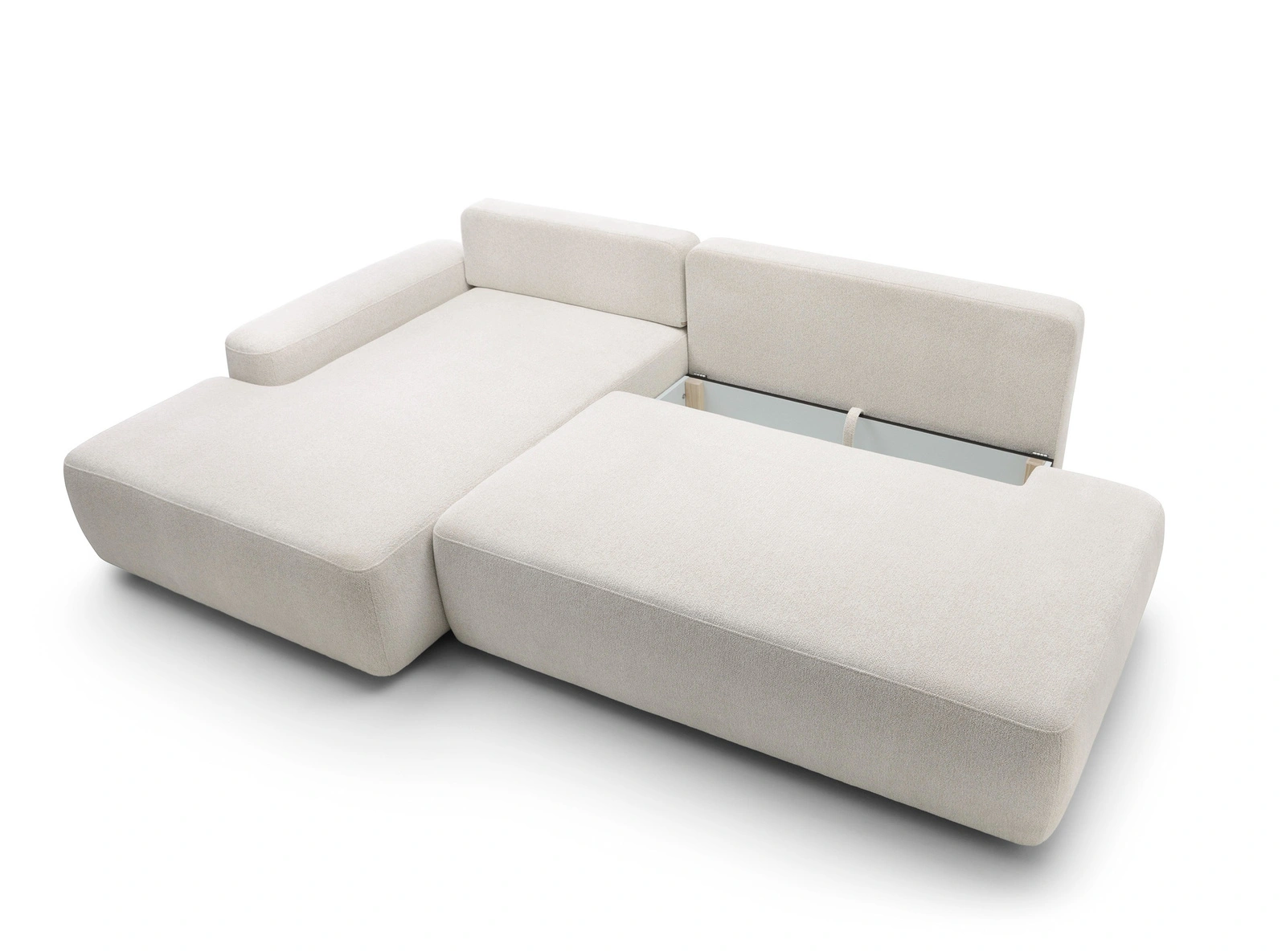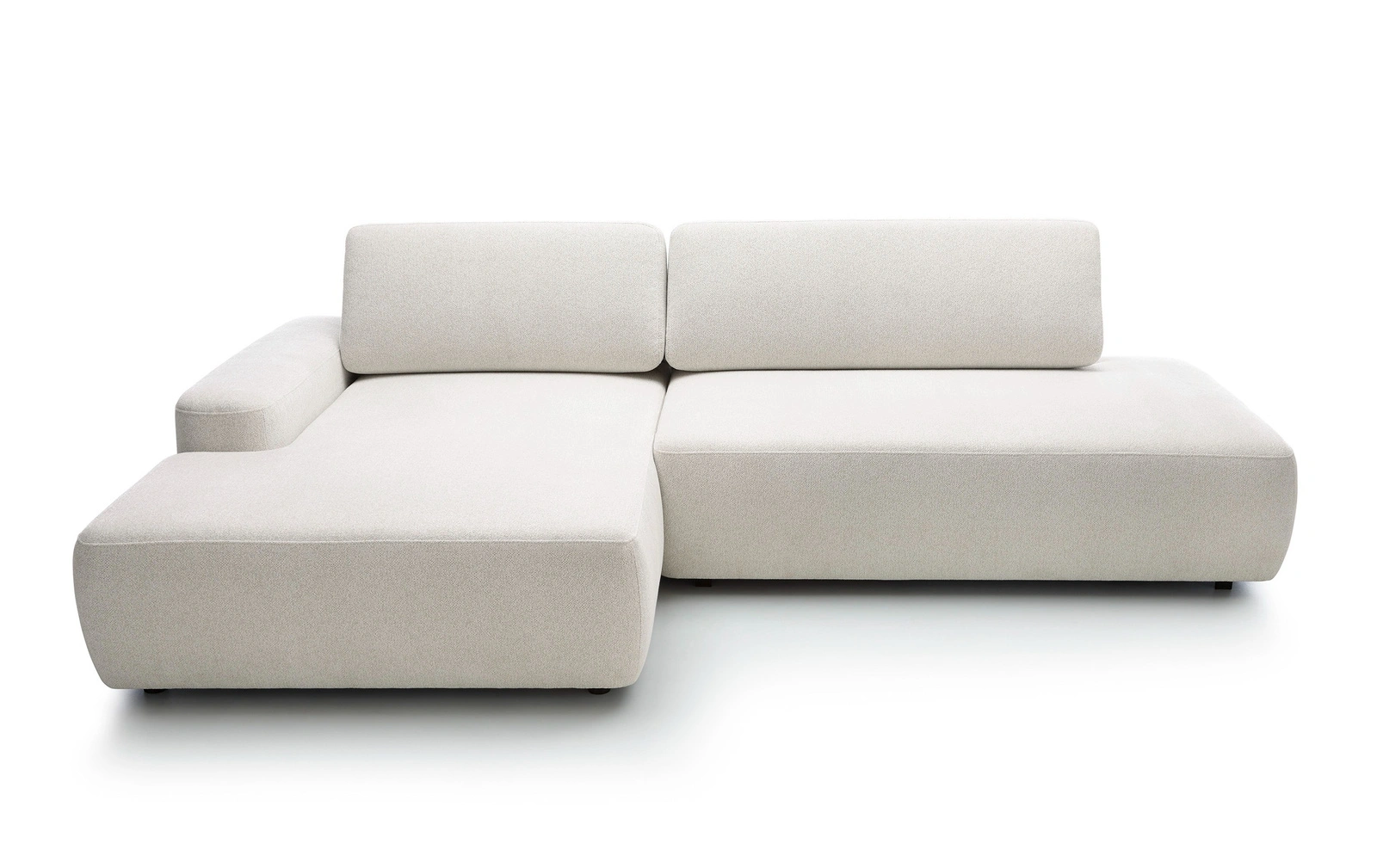 - Narożnik OLMI O (Raven 22, ecru) to jasna strona relaksu w rozmiarze XXL. Szerokość 276 cm, szeroki szezlong i ozdobne poduszki kulki w zestawie. Posiada funkcję spania (210x125 cm) i pojemnik. Tkanina Raven 400g/m²