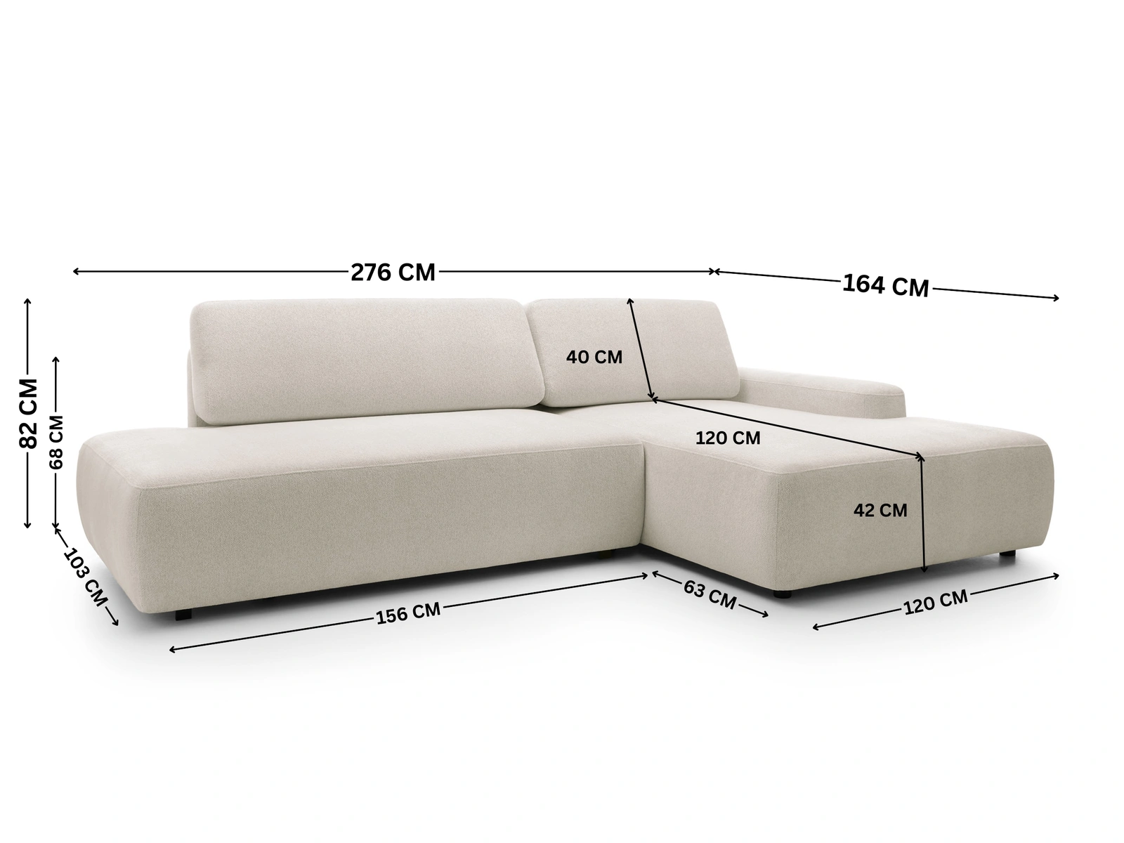 - Narożnik OLMI O (Raven 24, beż) to przytulna klasyka w rozmiarze XXL. Szerokość 276 cm, szeroki szezlong i ozdobne poduszki kulki w zestawie. Posiada funkcję spania (210x125 cm) i pojemnik. Tkanina Raven 400g/m².