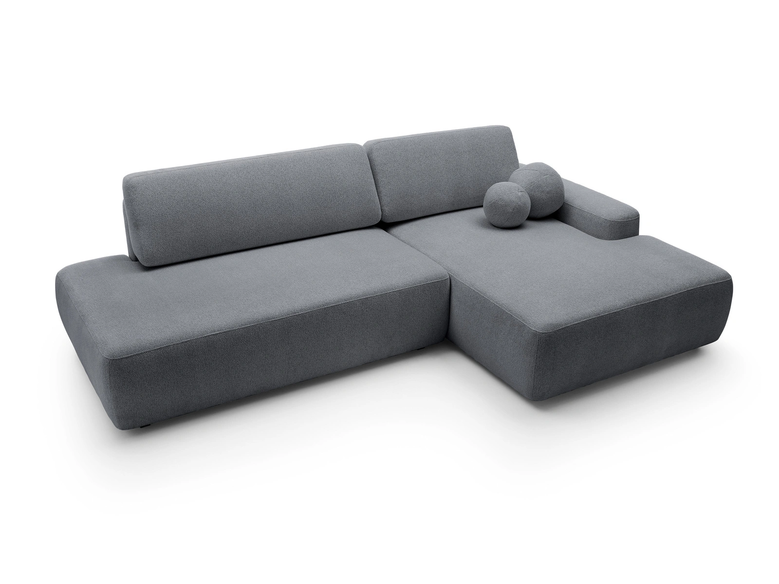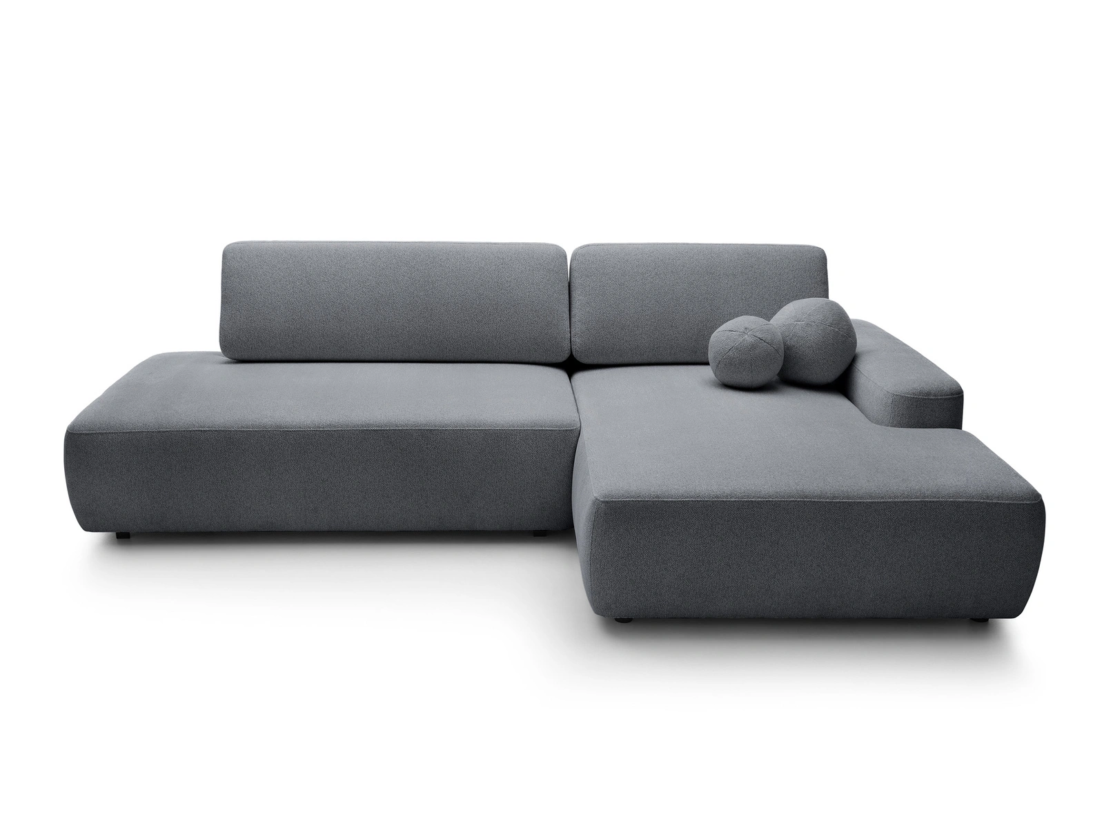 - Narożnik OLMI O (Raven 18, grafit) to nowoczesny design w powiększonym formacie. Szerokość 276 cm, szeroki szezlong i ozdobne poduszki kulki w zestawie. Posiada funkcję spania (210x125 cm) i pojemnik. Tkanina Raven 400g/m²