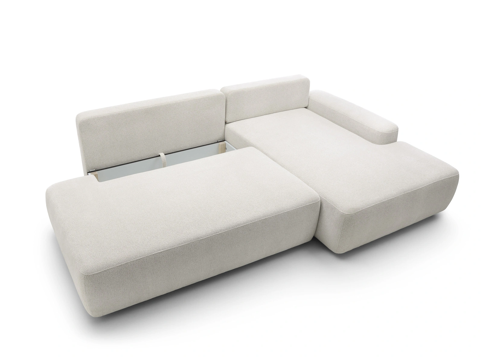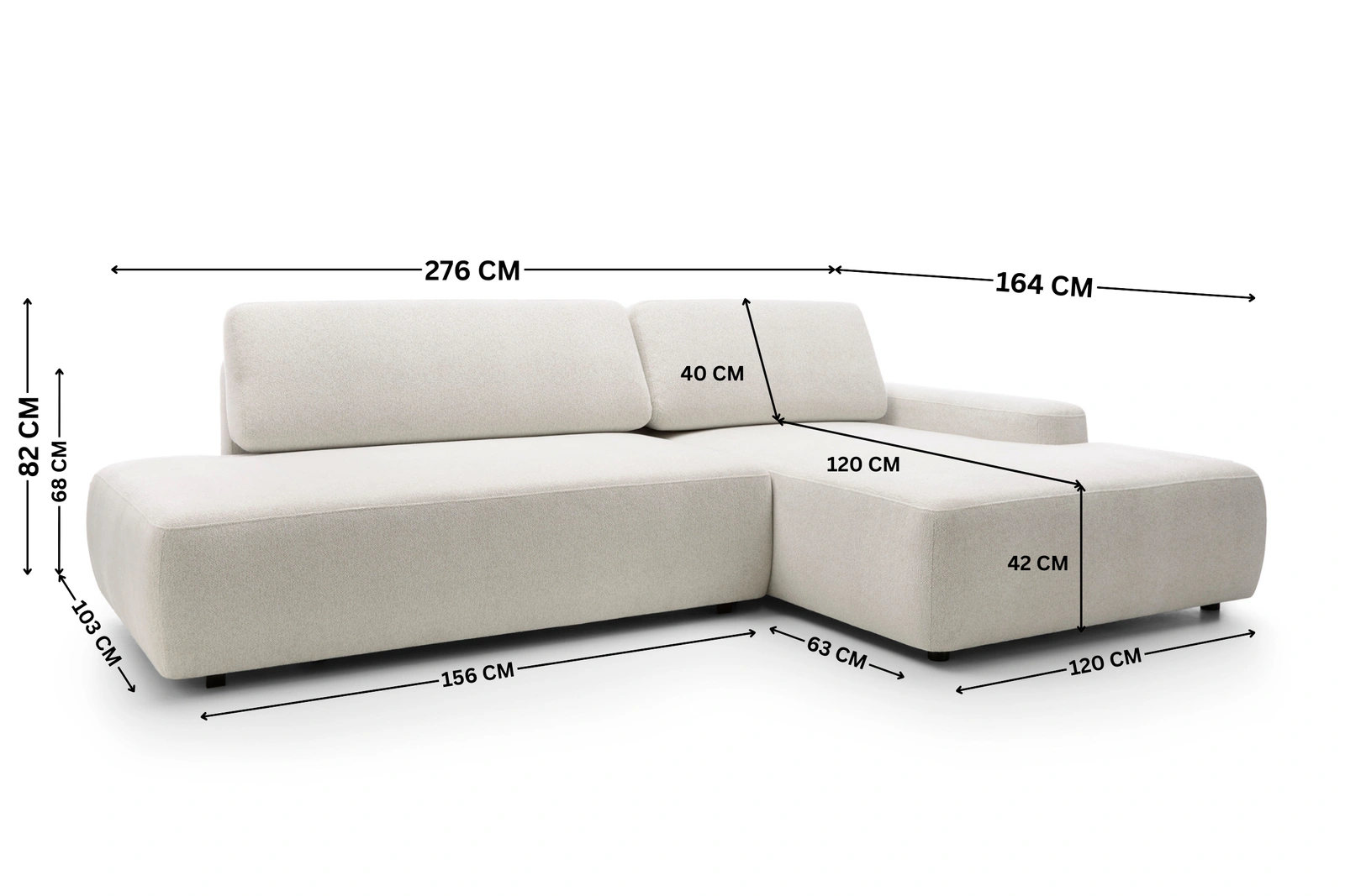 - Narożnik OLMI O (Raven 22, ecru) to jasna strona relaksu w rozmiarze XXL. Szerokość 276 cm, szeroki szezlong i ozdobne poduszki kulki w zestawie. Posiada funkcję spania (210x125 cm) i pojemnik. Tkanina Raven 400g/m².